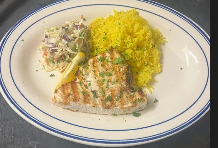Description: 8oz Piece of Swordfish grilled or blackened served with jasmine coconut rice and coleslaw.