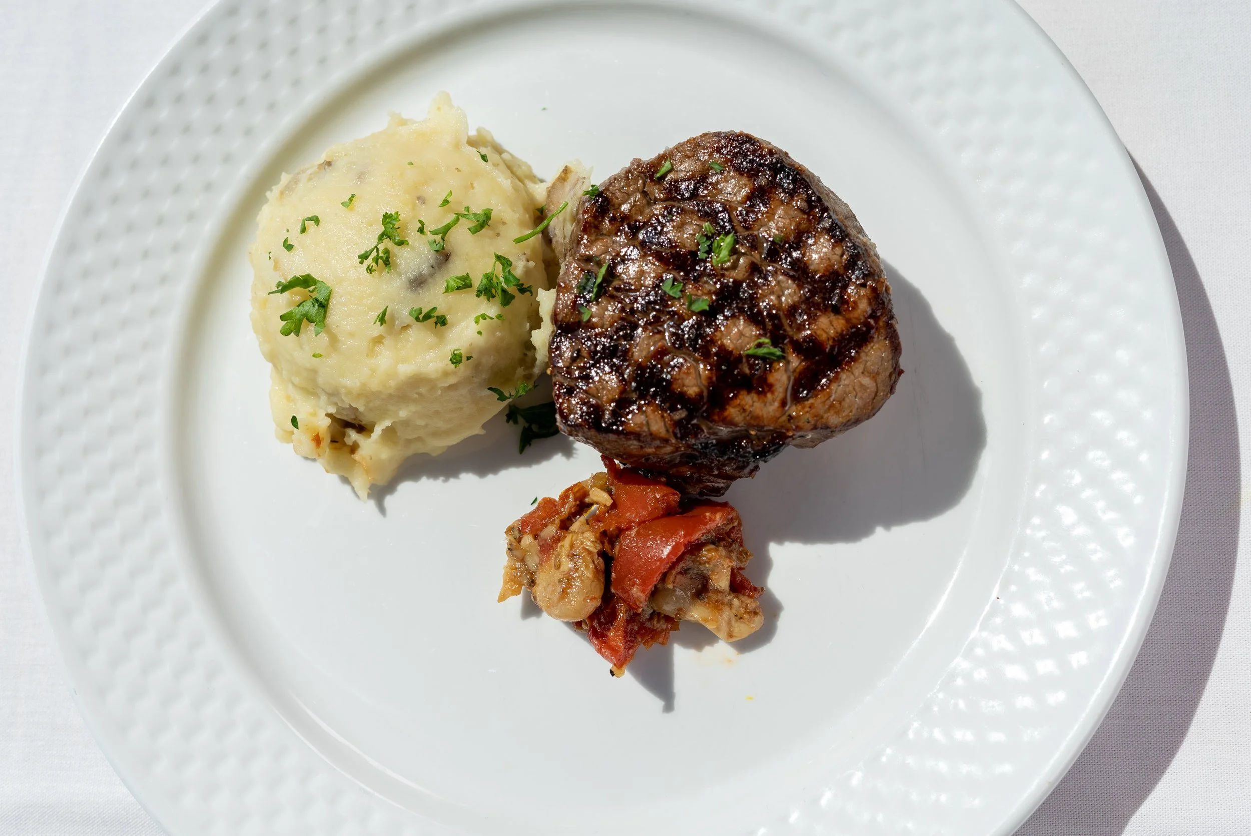 Description: Hand cut 6 or 10 ounce filet mignon simply seasoned and served with Mashed Potatoes and a roasted tomato and garlic confit.