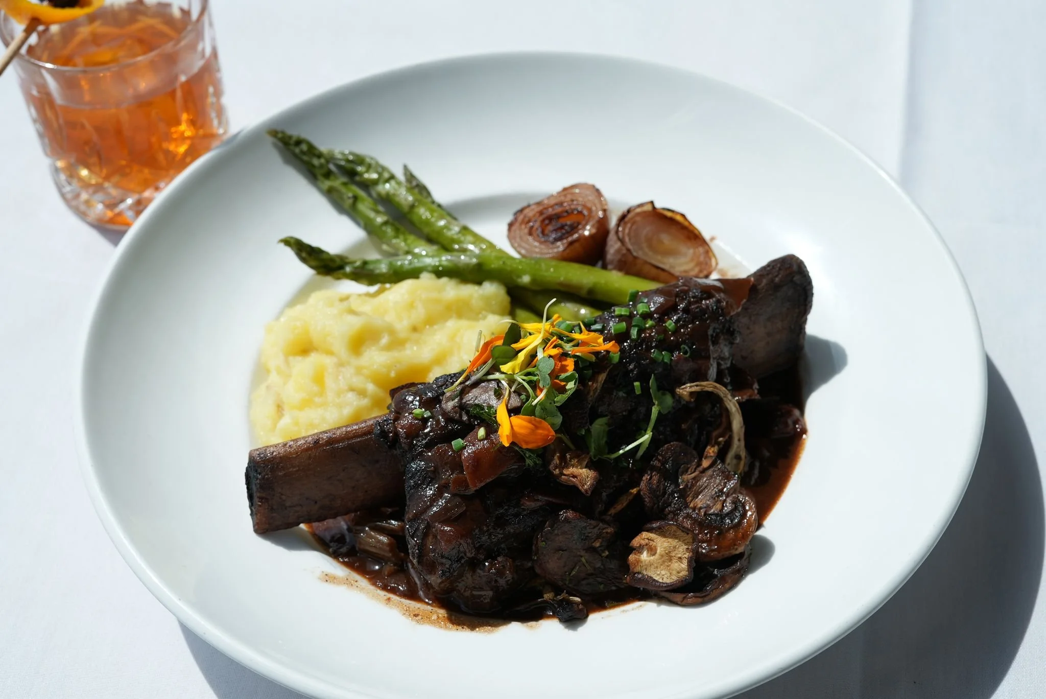 Description: slow braised in zinfandel wine and aromatics, served over mashed potatoes, grilled asparagus roasted shallot, topped with wild mushroom jus