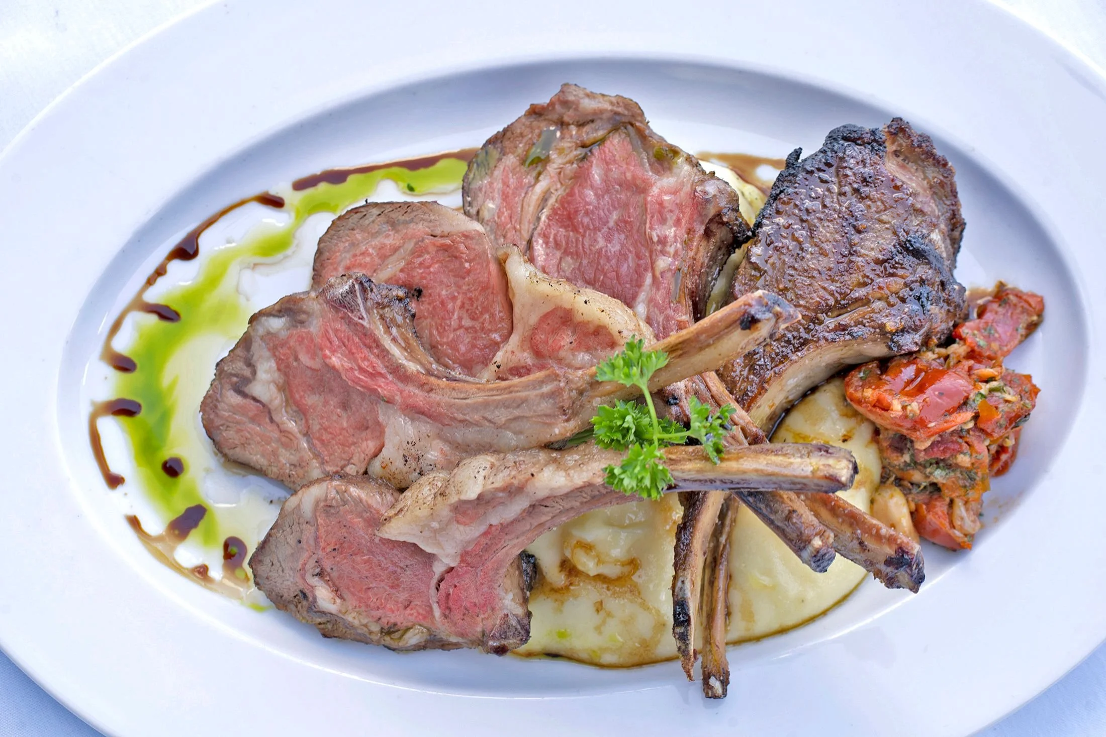 Description: 2 double boned (14oz) roasted Australian rack of lamb, flavored with our dried porcini rub served sliced over Yukon gold mashed potato, roasted garlic and tomato confit, and finished with our 12 year aged balsamic and chimichurri.