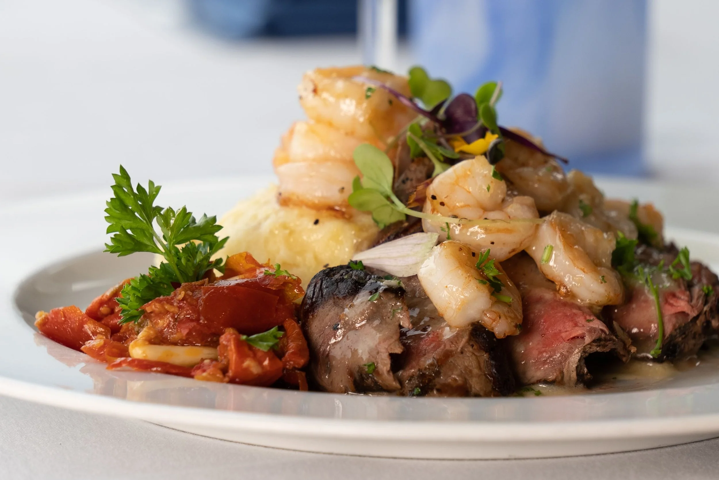 Description: 8oz. Sliced sirloin and 5 each 16/20 Scampi shrimp. Served with mashed potatoes and tomato-garlic confit