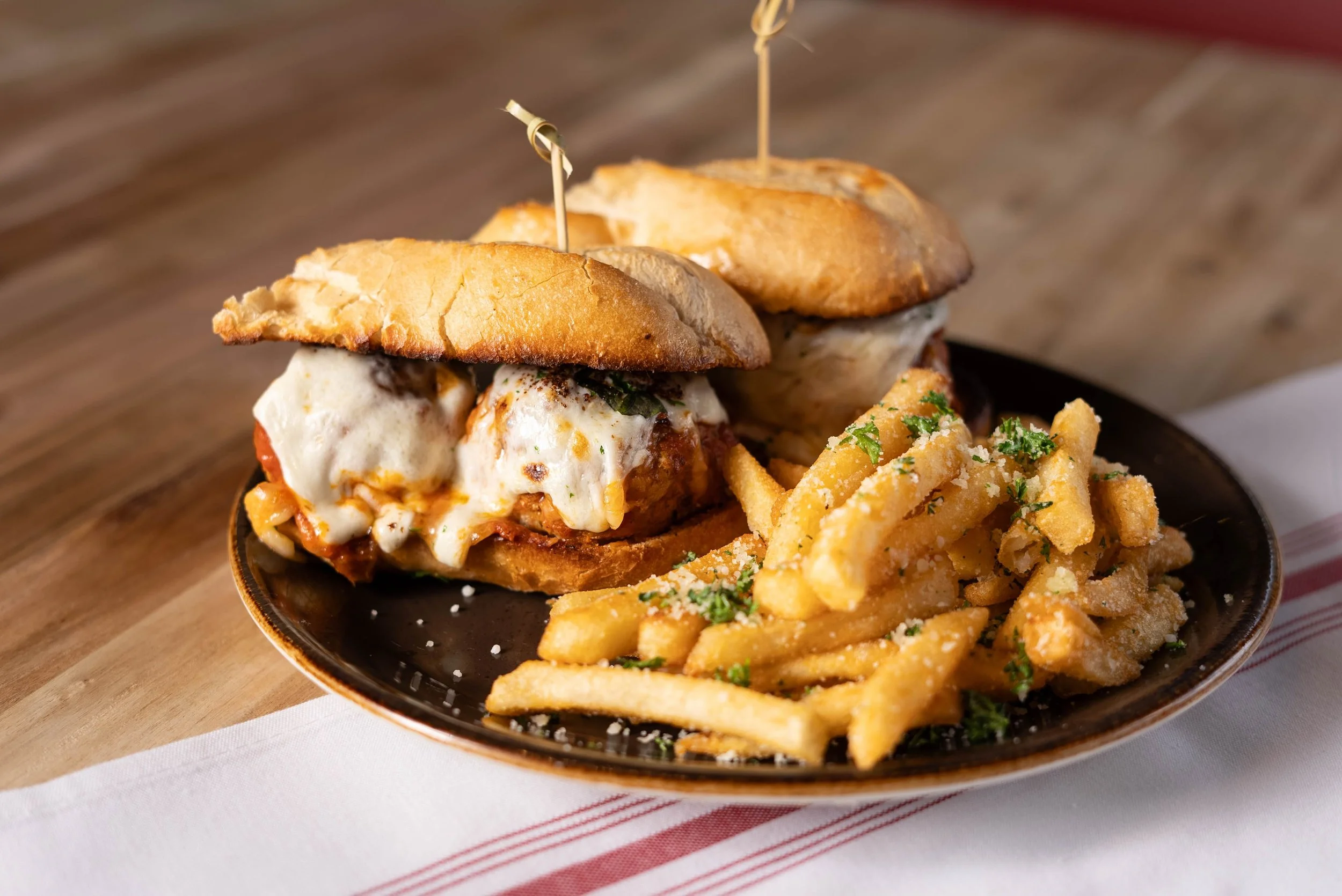 Description: 2 ~ 4 ounce pieces of Breaded veal, fresh mozzarella, marinara sauce, on Italian Hoagie Roll, torn basil leaves served with Fries.