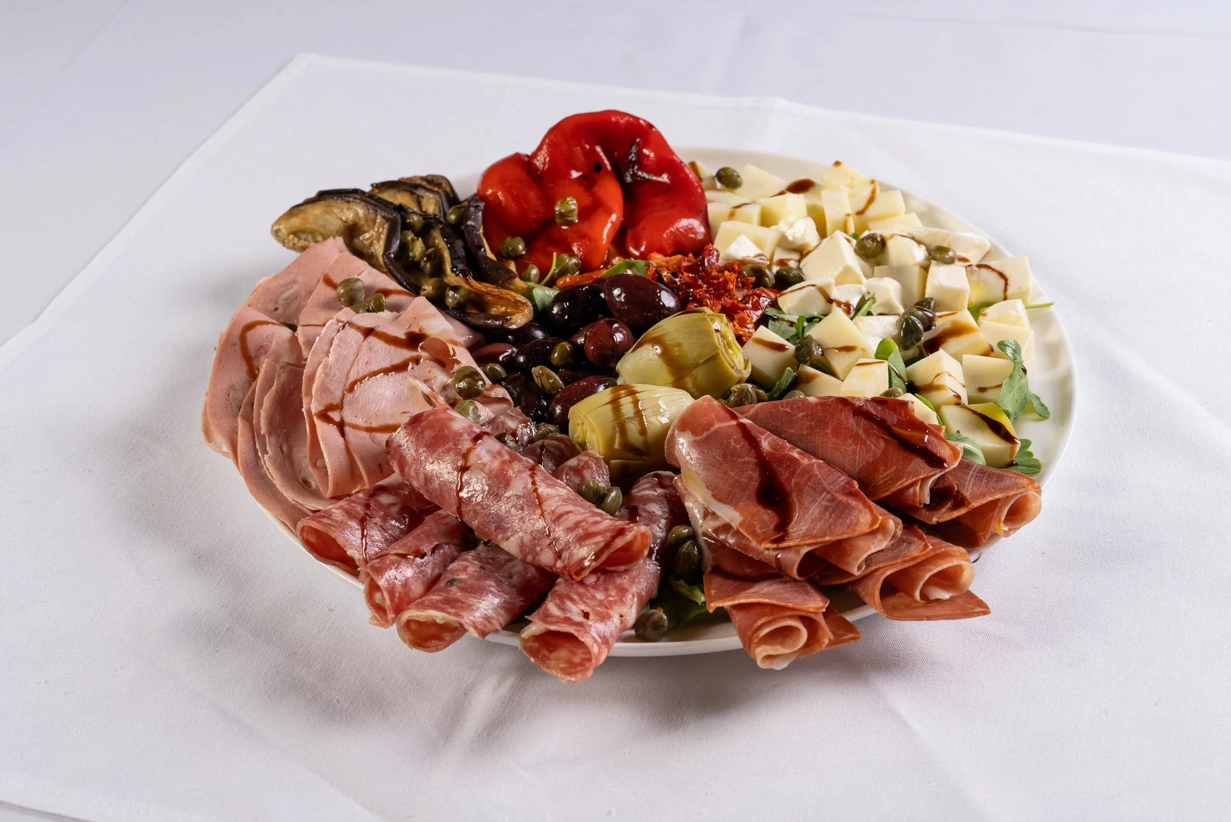 Description: prosciutto crudo, mortadella, soppressata, aged provolone, roasted eggplant, fresh mozzarella, sun-dried tomatoes, roasted red peppers, artichoke hearts, oil cured black olives, dates and capers, drizzled with EVOO and imported aged balsamic glaze.
