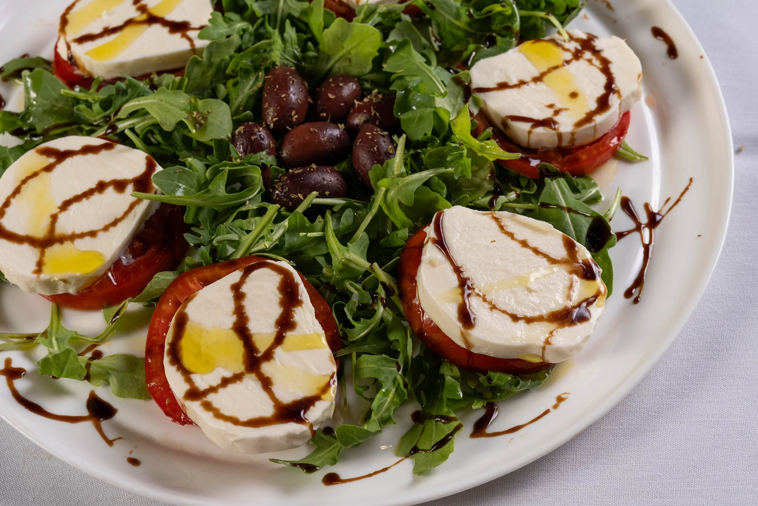 Description: Fresh Mozzarella and imported Greek feta cheese atop sliced beefsteak tomatoes and arugula, drizzled with EVOO and imported aged balsamic glaze.