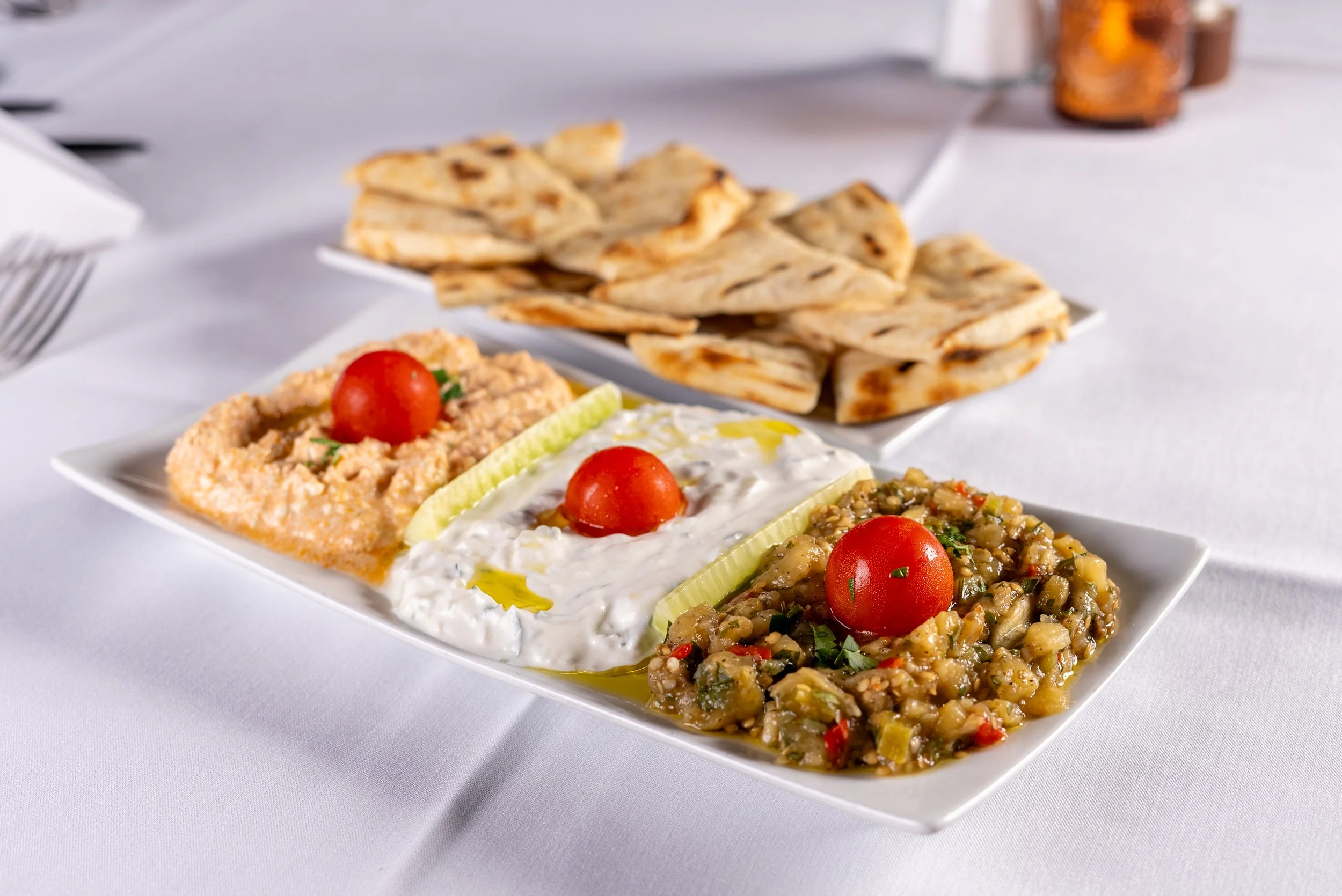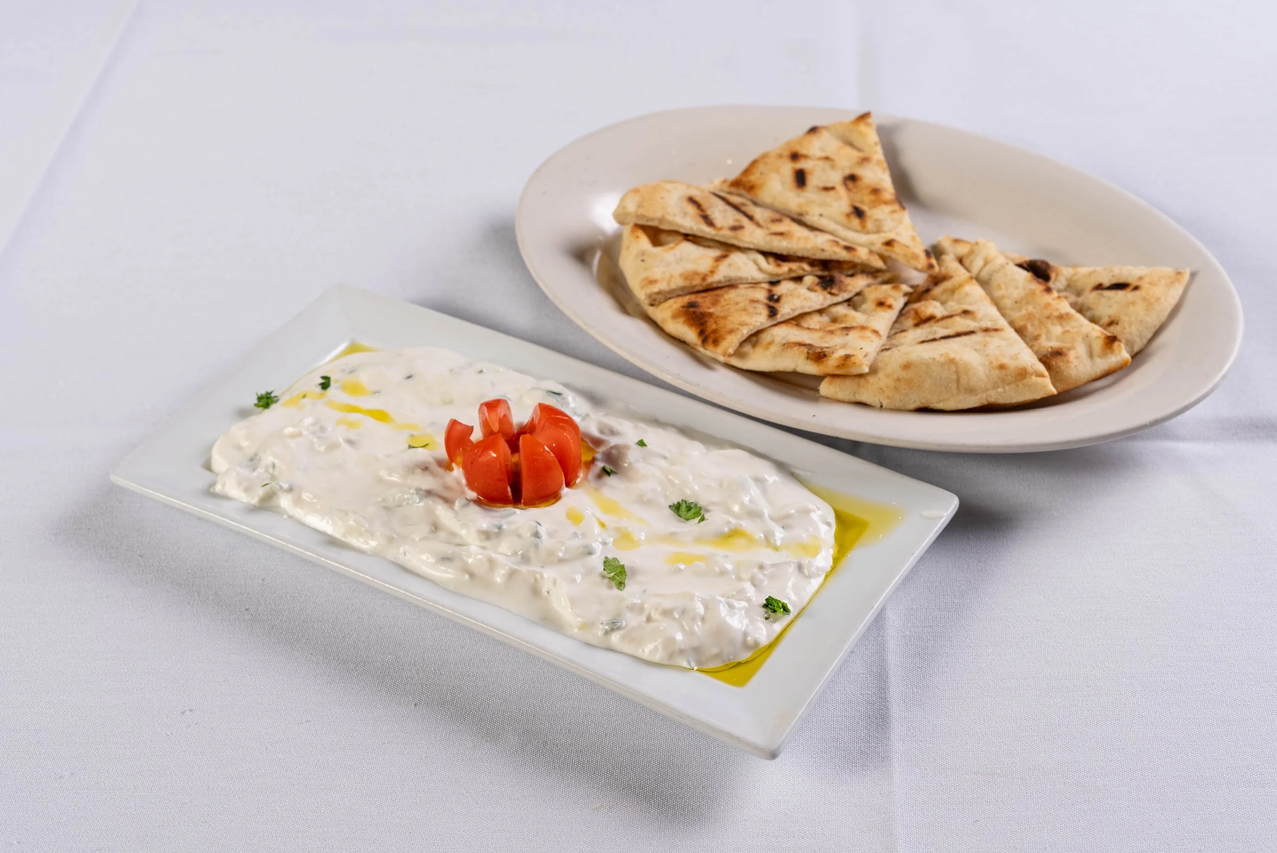Description: Yogurt and cucumber garlic spread, served with pita bread