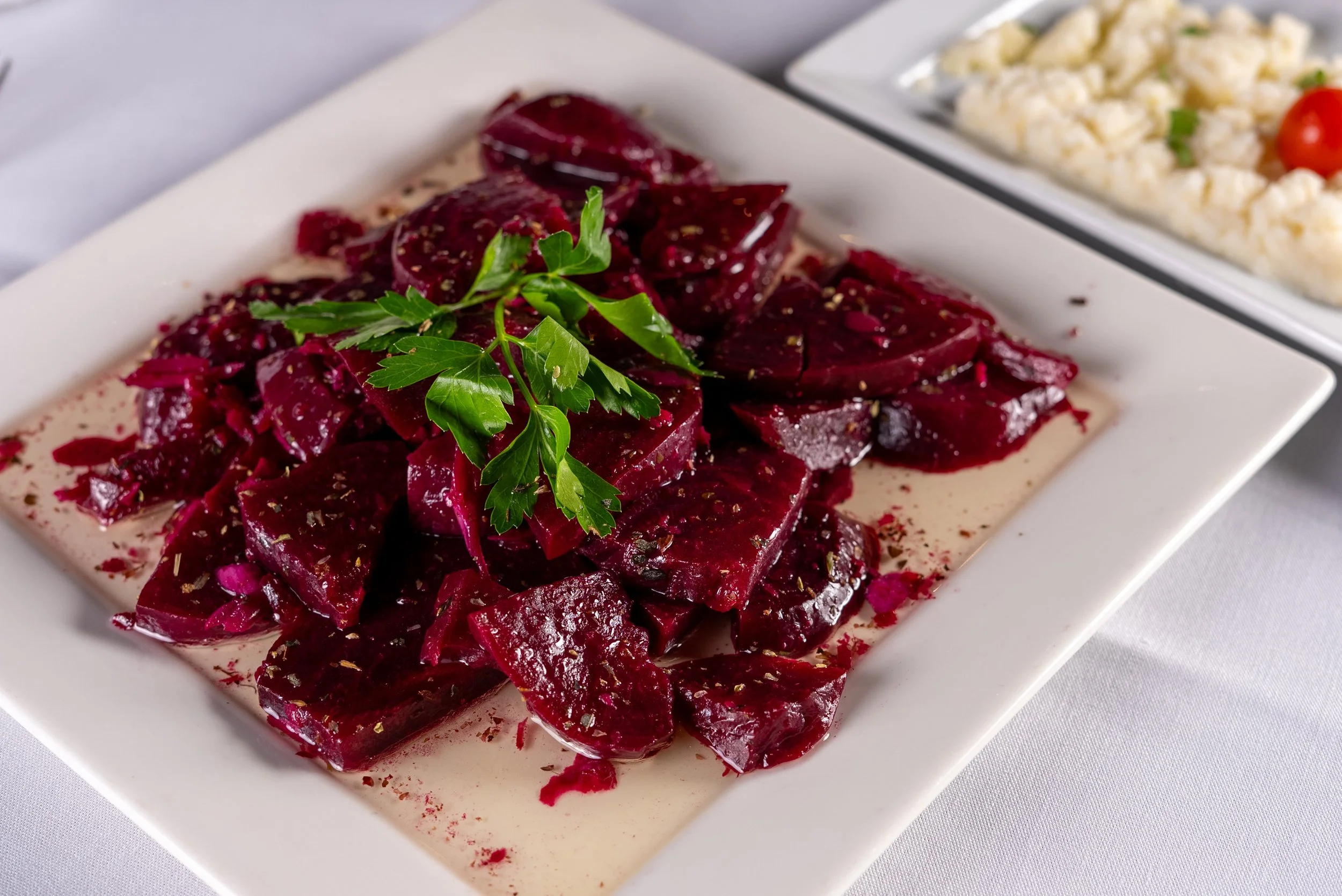 Description: House made marinated beets in garlic and olive oil served with skordalia.