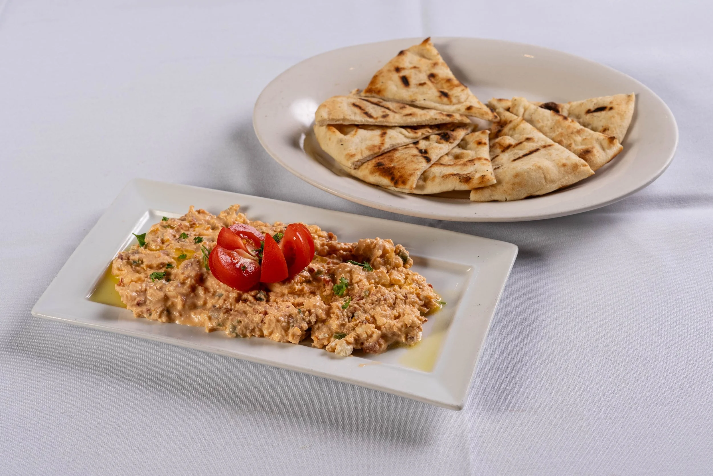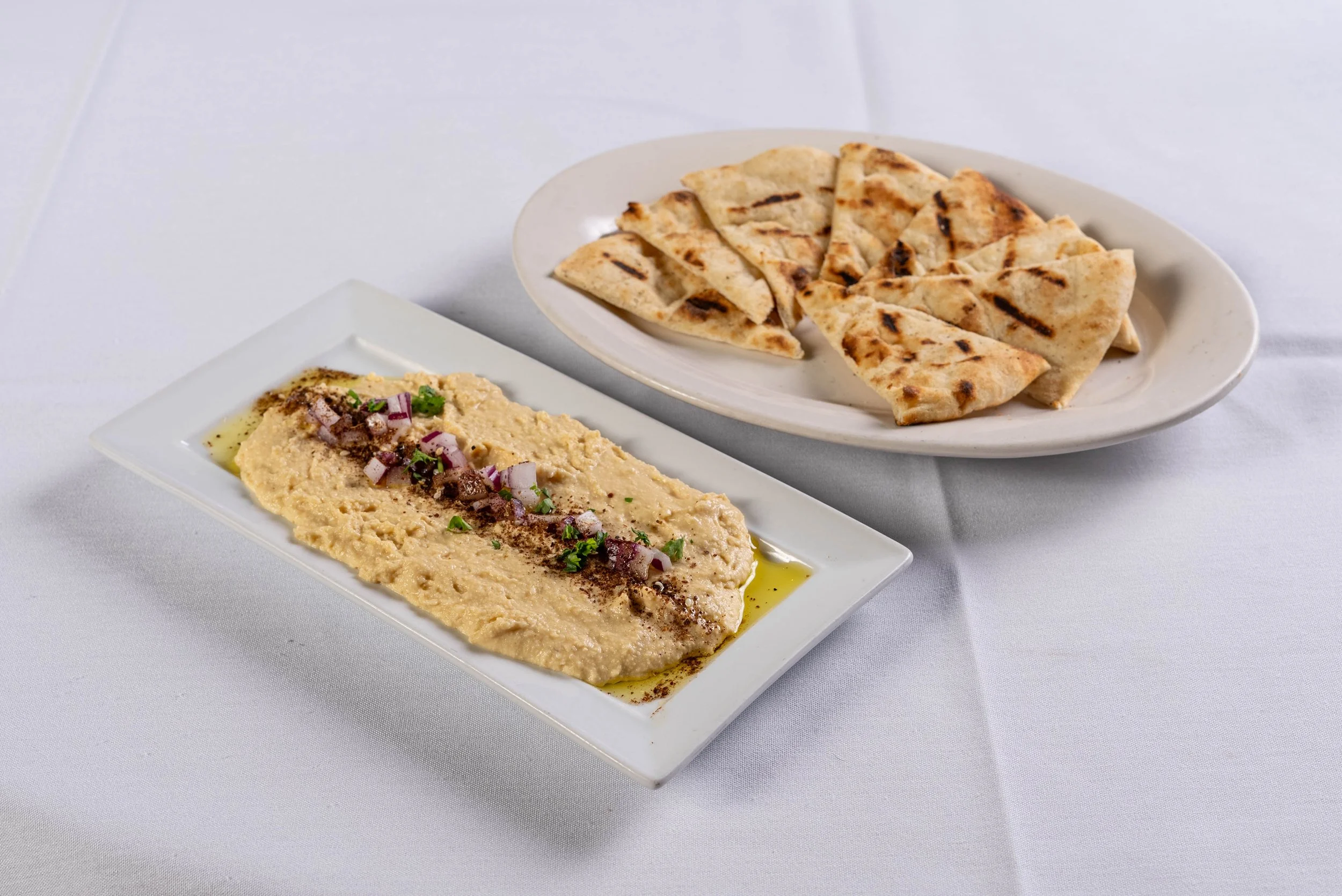 Description: Chickpea puree, tahini, fresh garlic, olive oil and fresh lemon juice, served with pita bread.