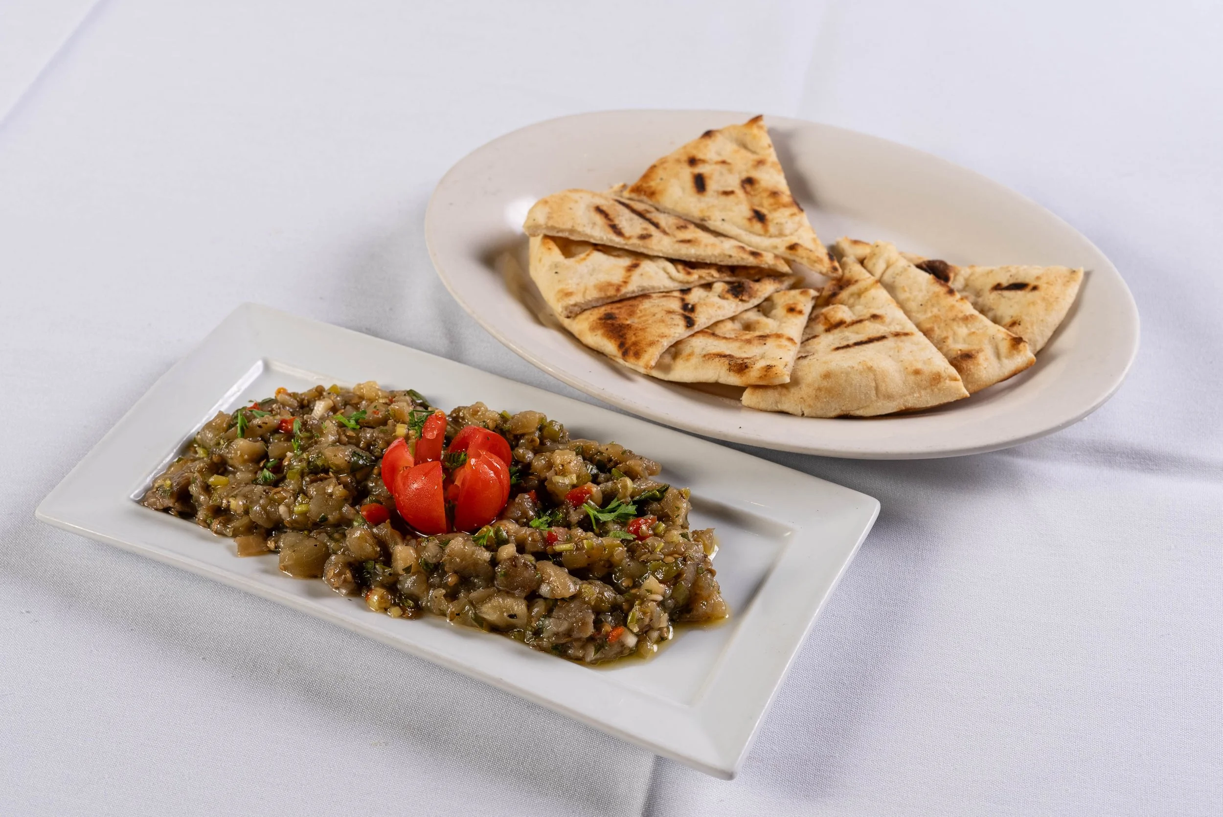 Description: House made roasted eggplant spread, served with pita bread.