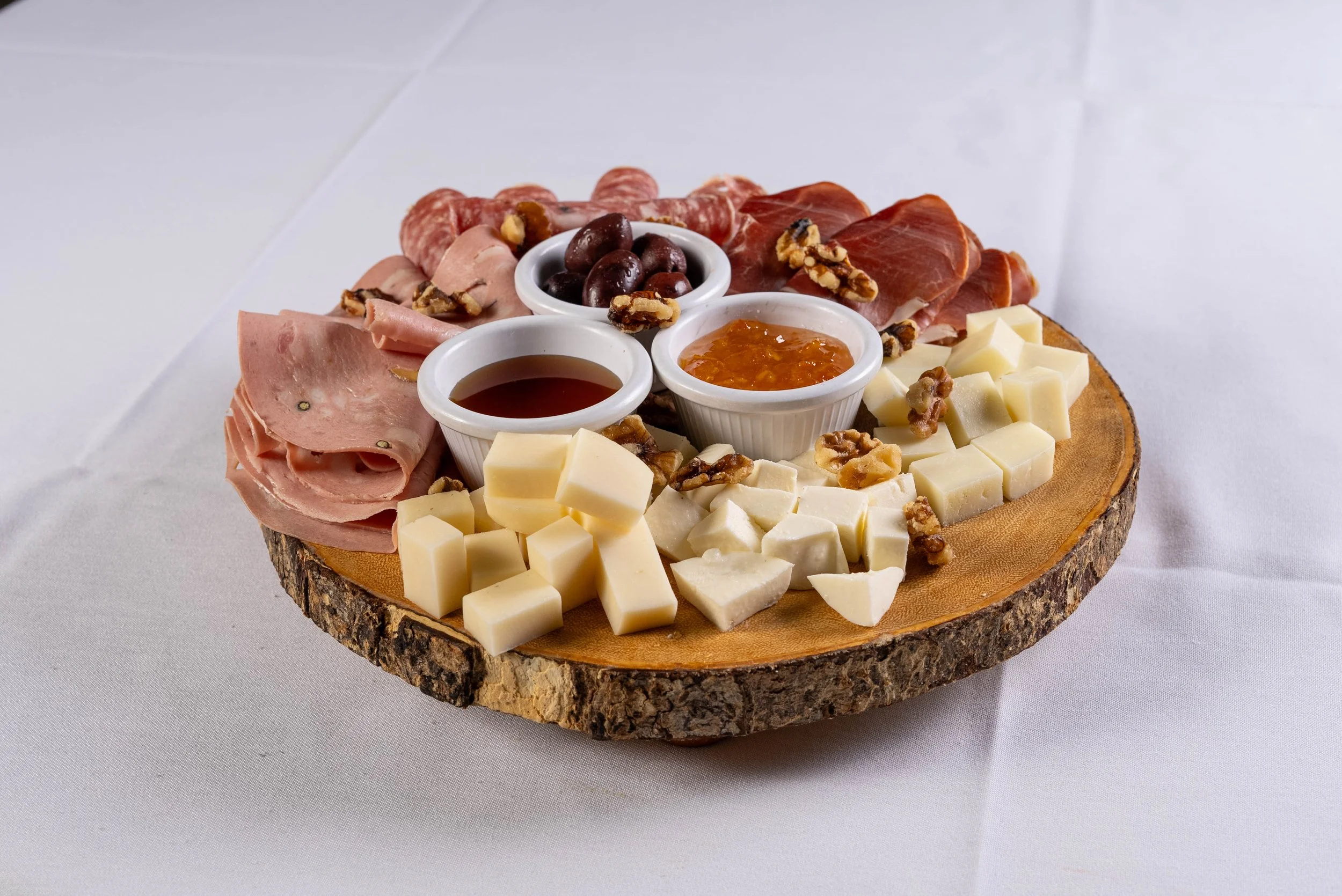 Description: assortment of four imported cheeses, dry-cured meats, kalamata olives, dates, walnuts, with honey and jam, served with crostini.