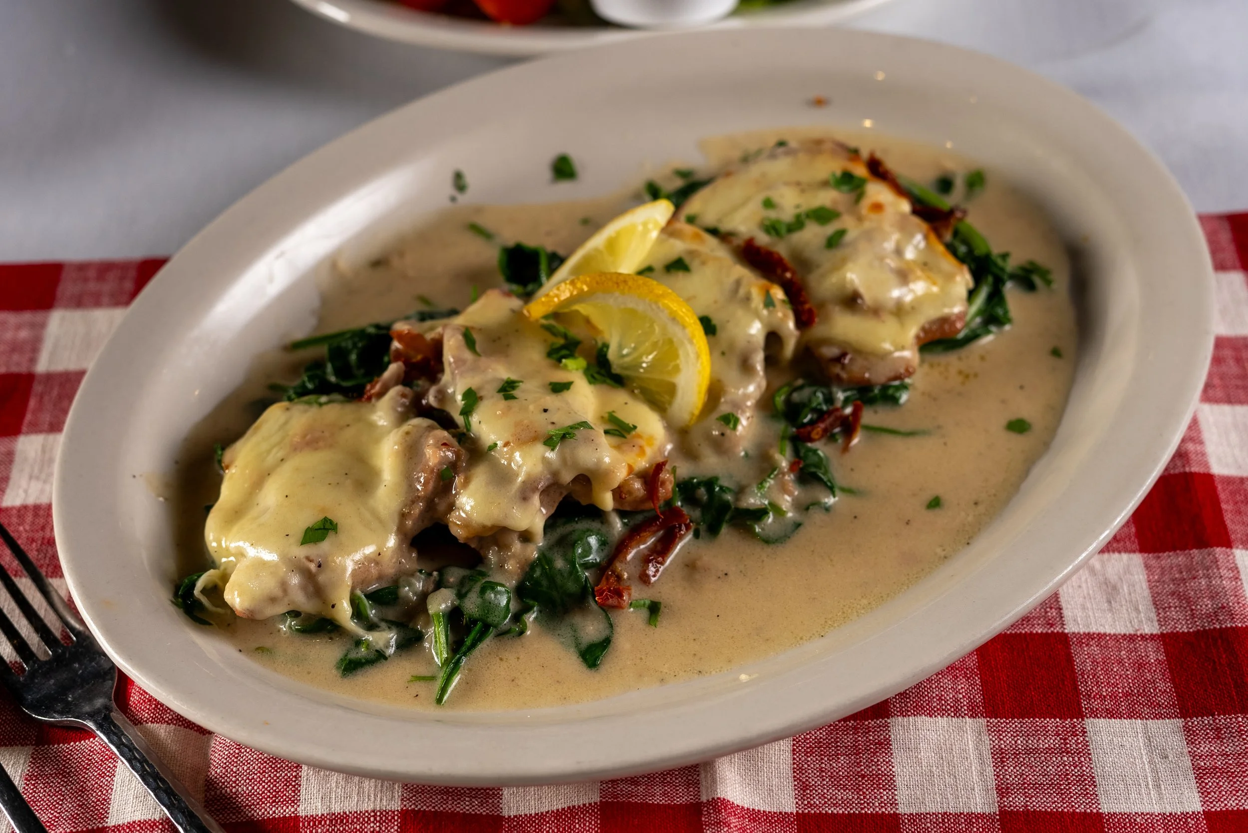 Description: sautéed veal topped with prosciutto cotto and mozzarella, prepared in a white wine butter sauce, seasoned with sage, served over fresh steamed spinach