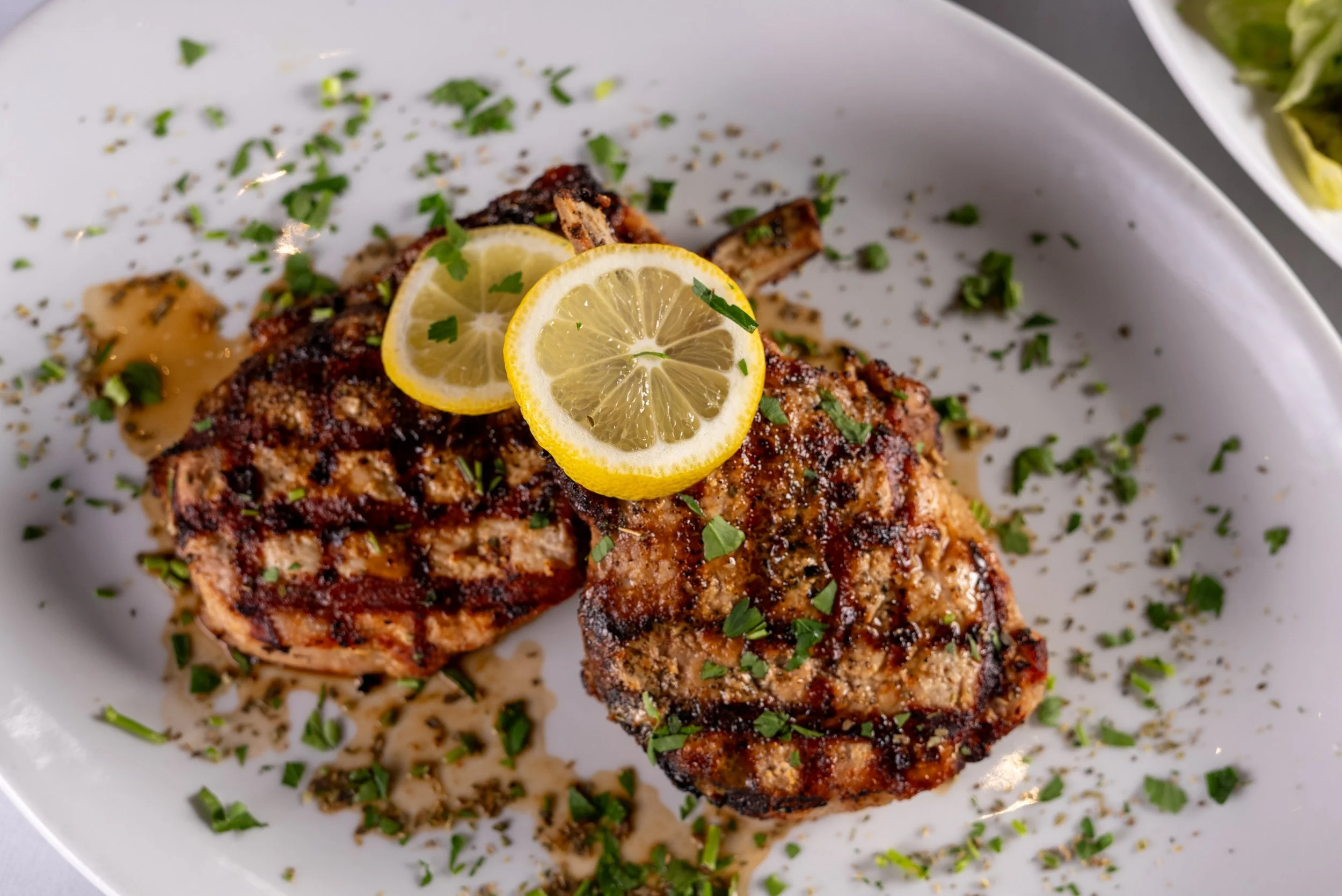 Description: Our famous center cut pork chop, greek style, seasoned and grilled to perfection