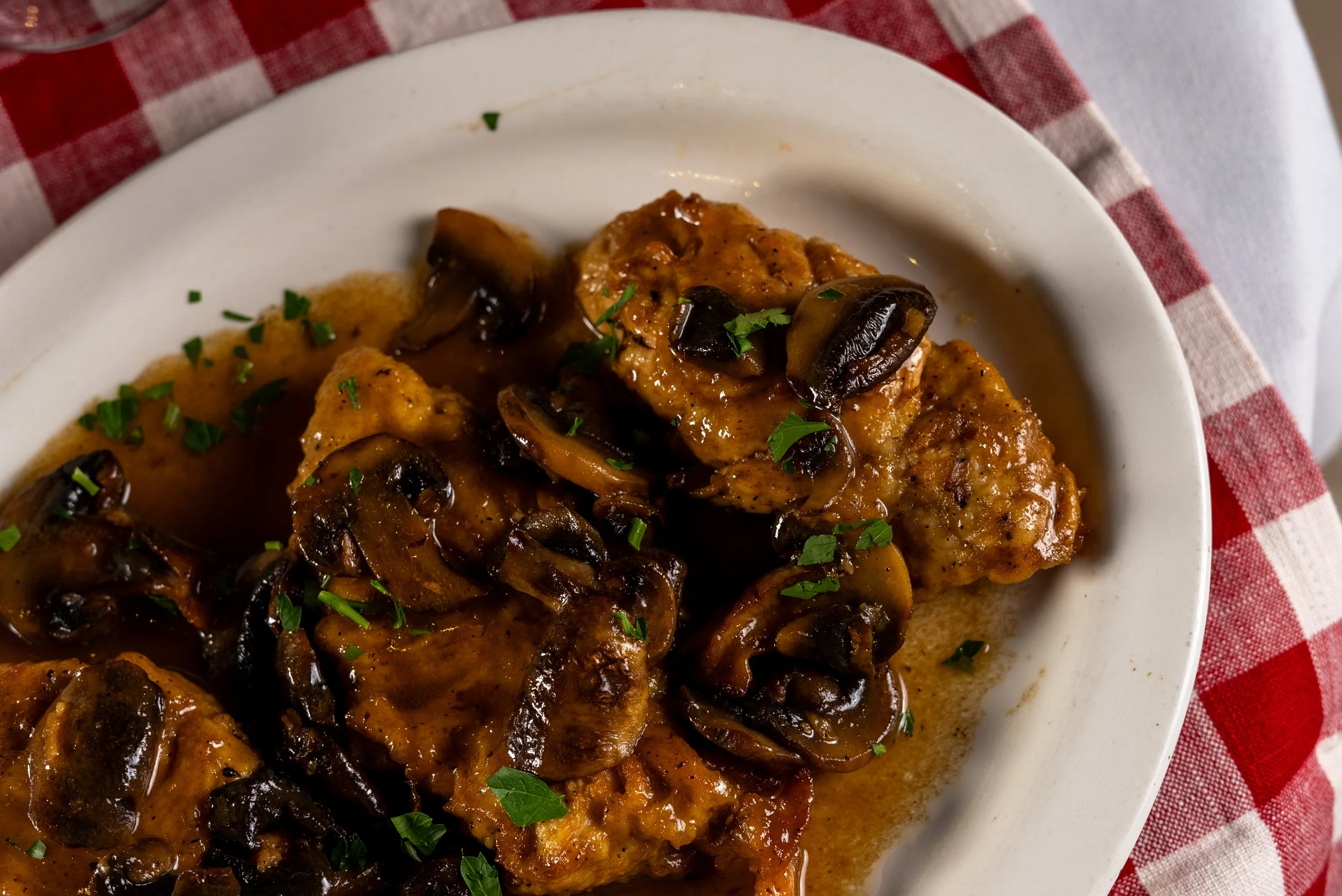 Description: pan-seared chicken scallopini or veal simmered in rich marsala wine sauce made with natural chicken stock and mushrooms