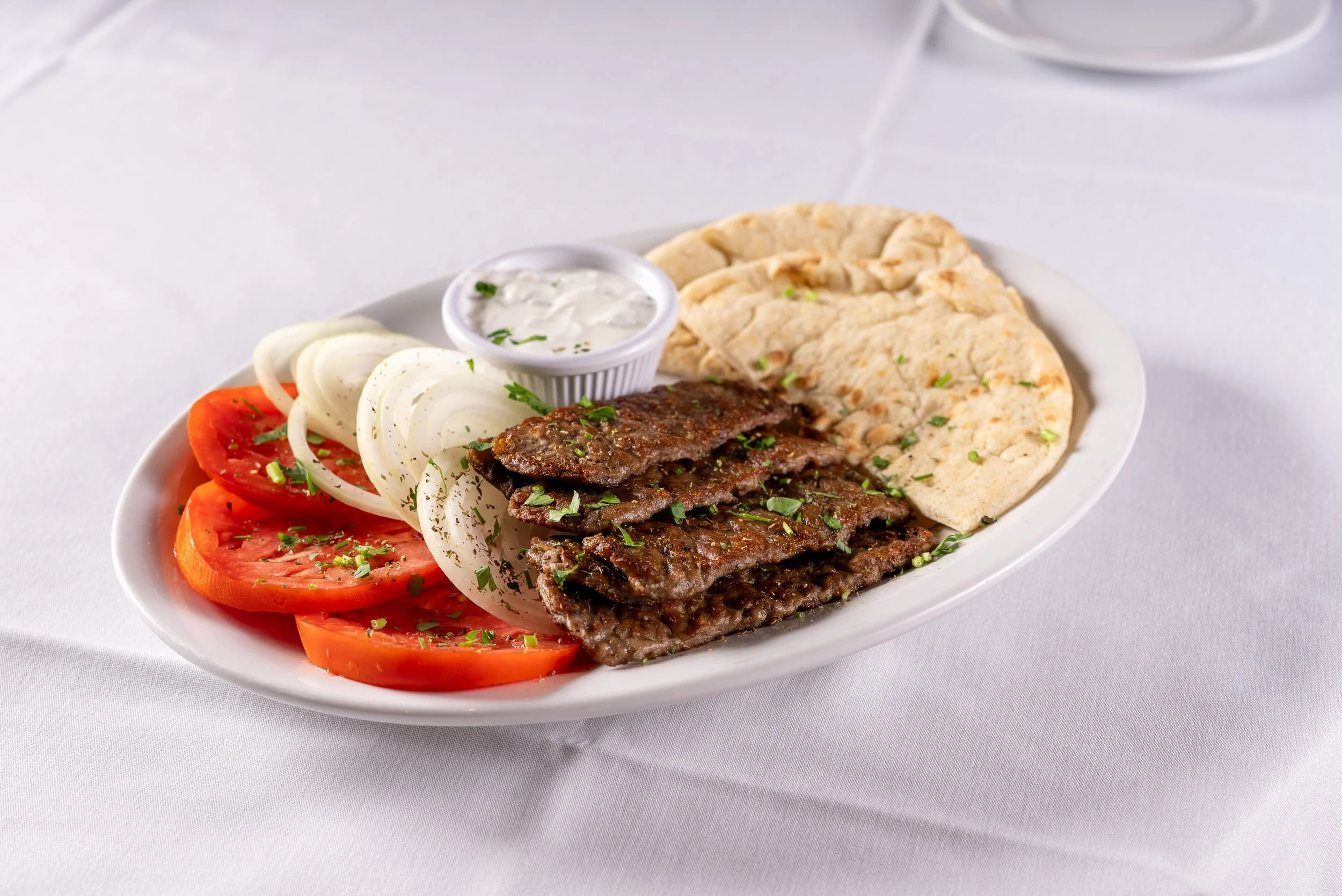 Description: The best gyro meat in town, served with pita bread, sliced tomatoes, onions and our house made tzatziki.