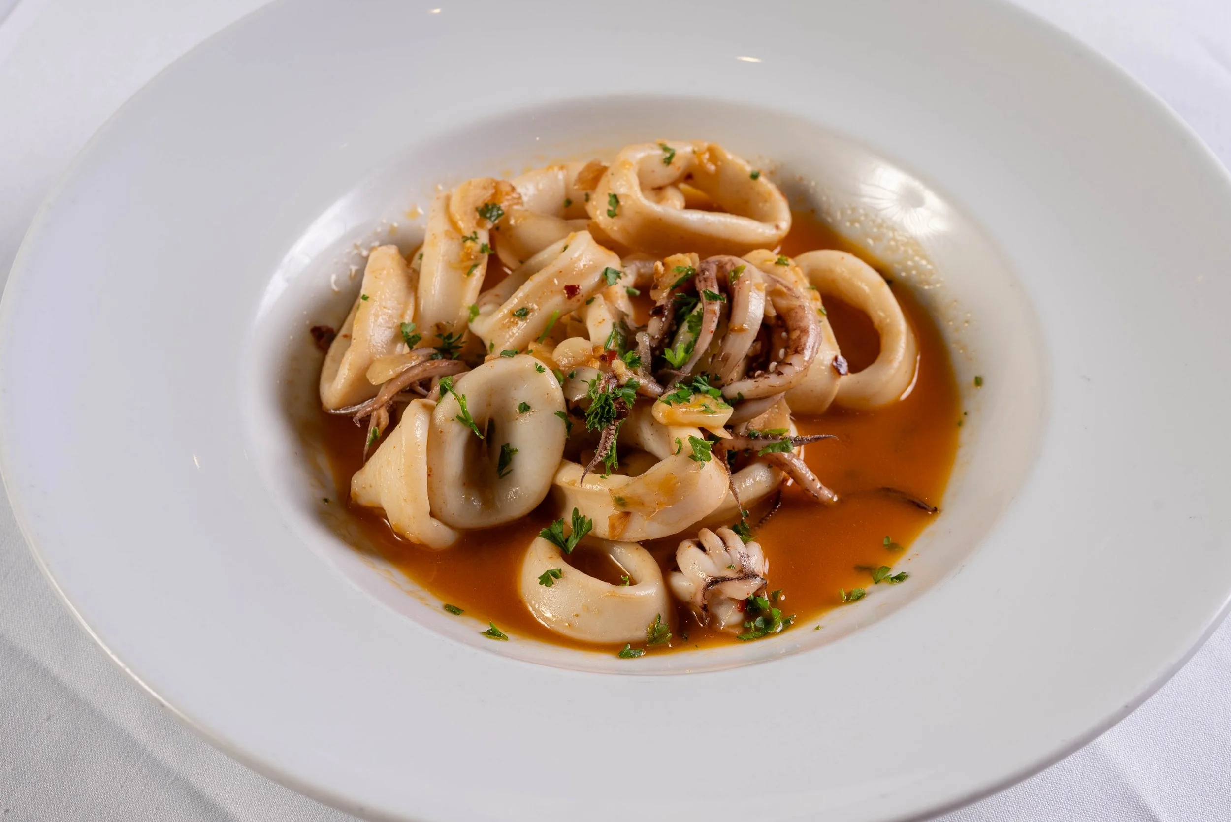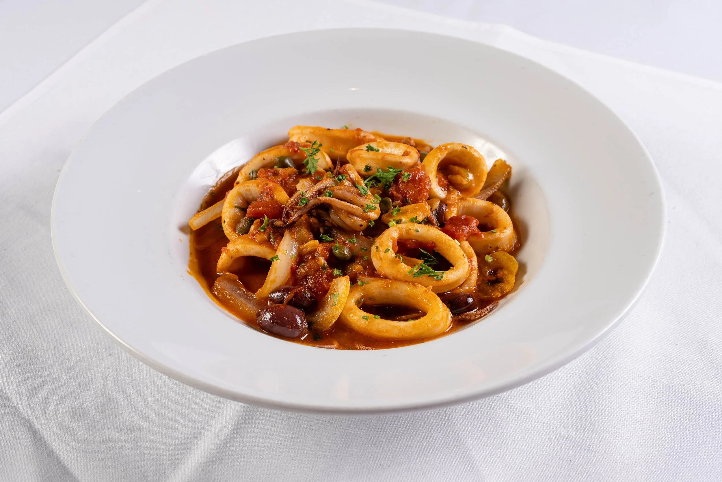 Description: Calamari sautéed in savory sauce of EVOO, garlic, onions, capers, kalamata olives, banana peppers and san marzano tomatoes.