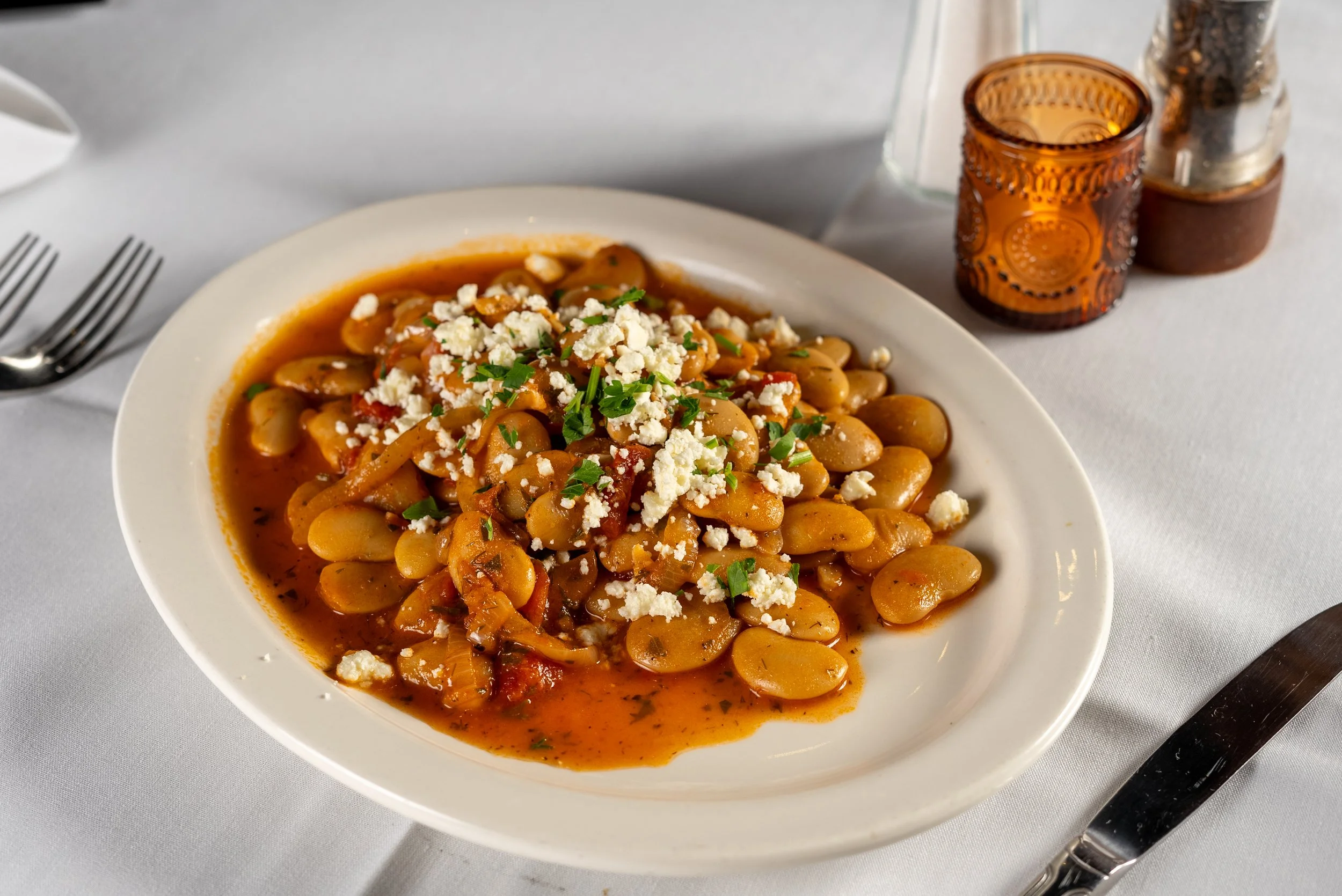 Description: Greek lima beans, baked in a tomato and herb sauce with crumbled feta.