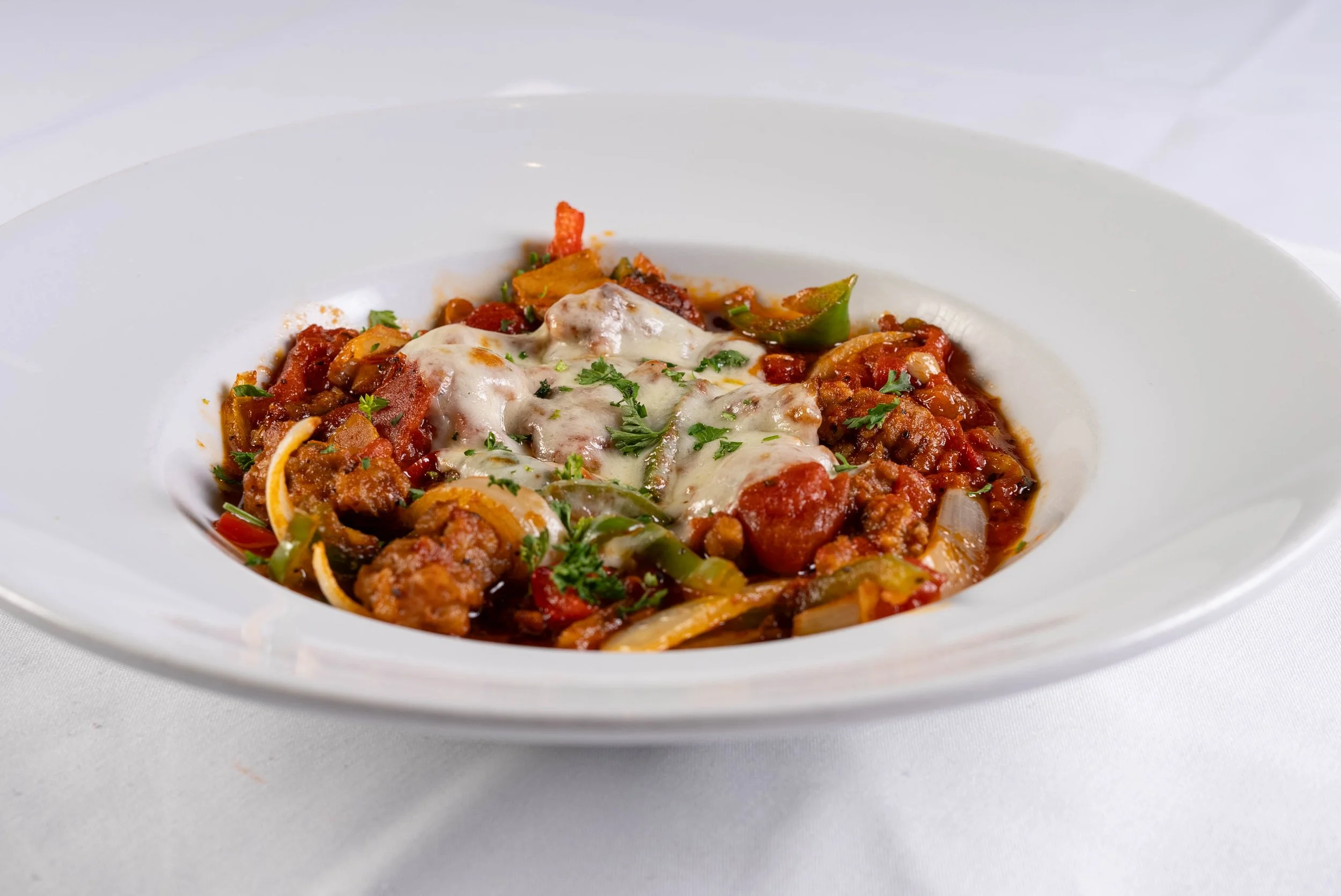 Description: Choice of sausage or pork tenderloin, with peppers and onions sautéed in tomato sauce and topped with mozzarella.
