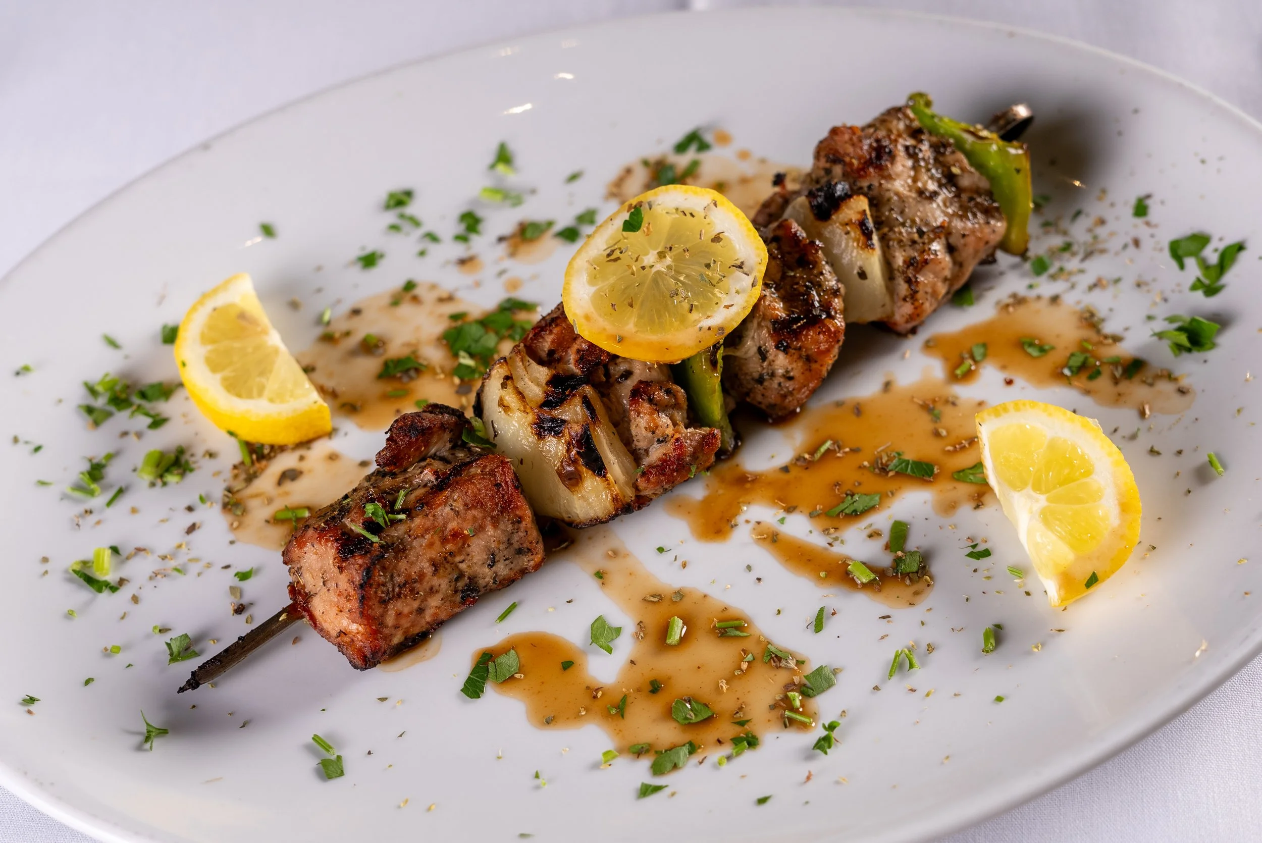Description: Four mini marinated pork skewers, served with pita and tzatziki.
