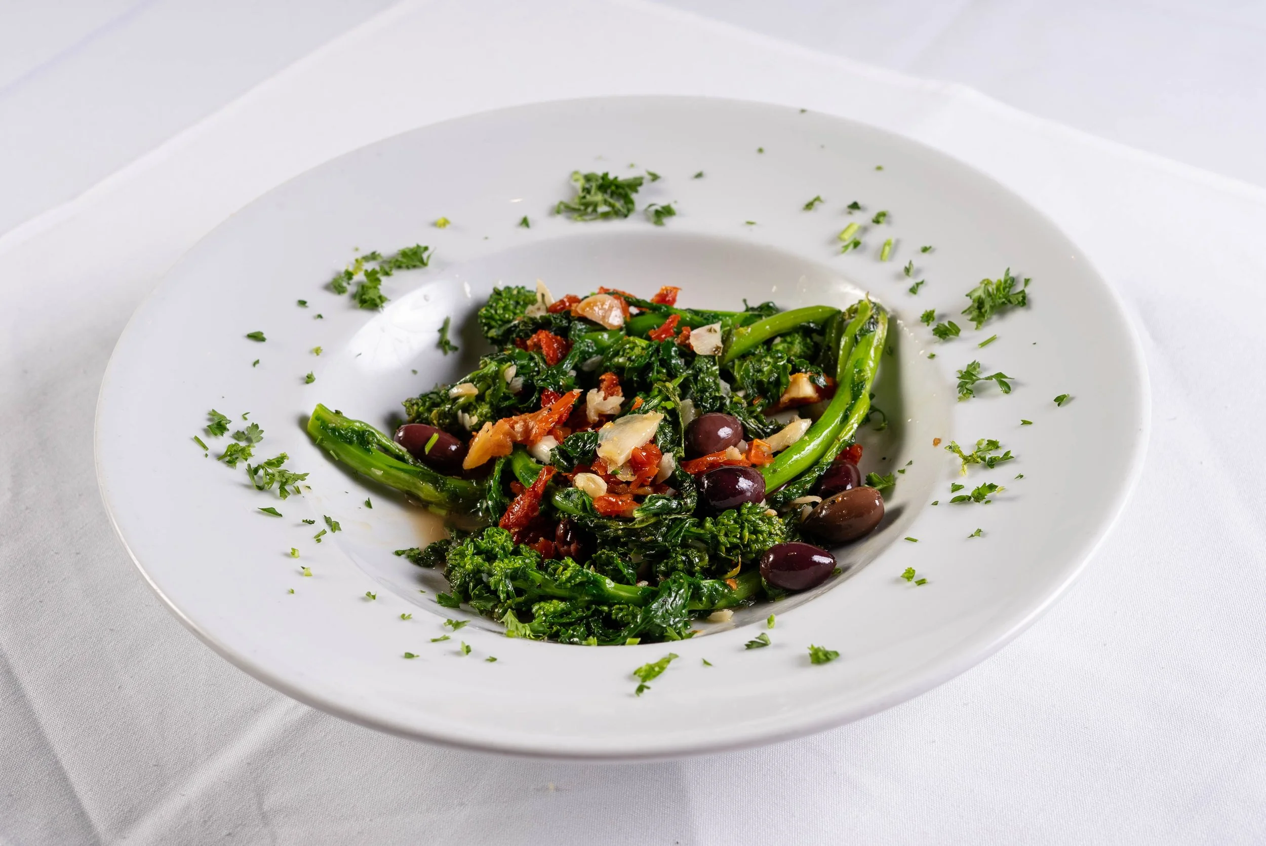 Description: Fresh broccoli rabe, sautéed in EVOO, garlic, sun-dried tomatoes and oil cured black olives.
