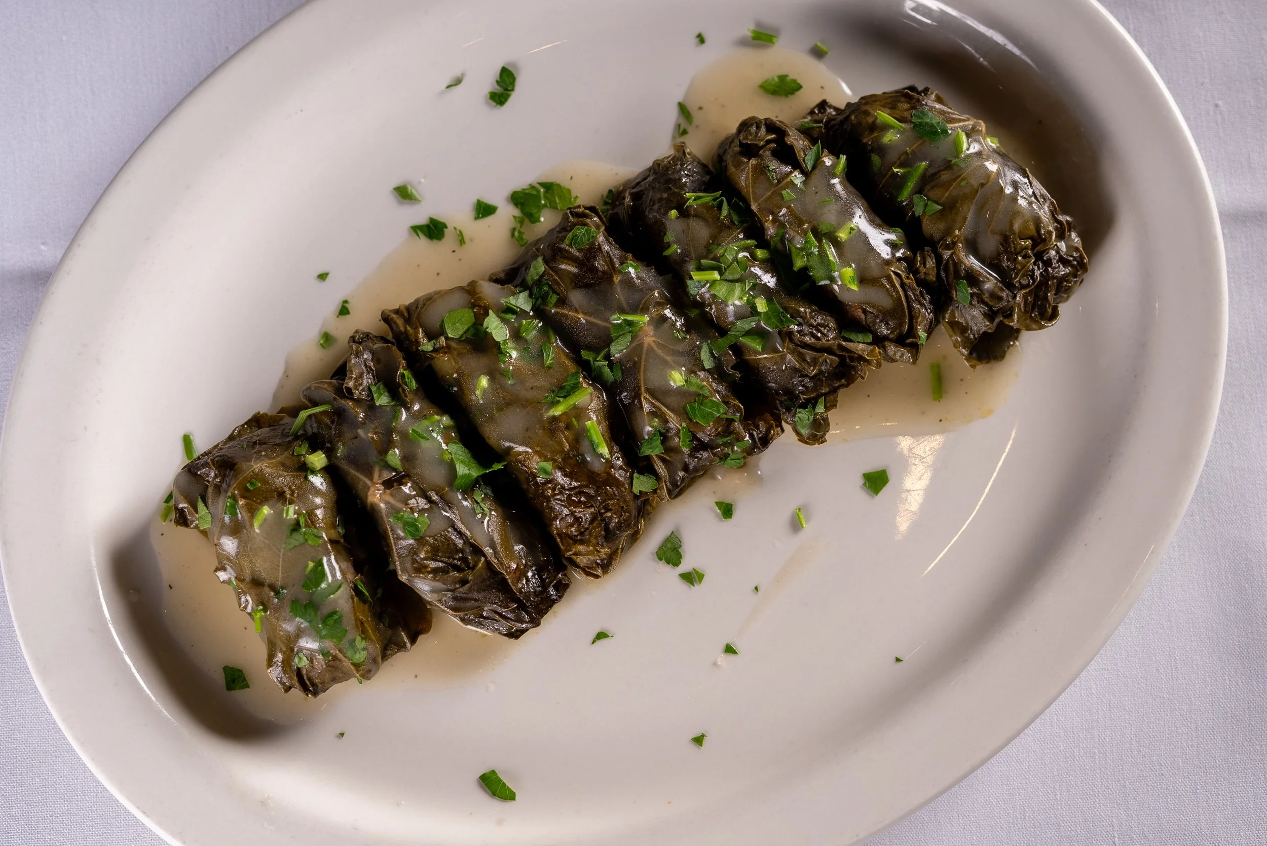 Description: Ground meat mixed with rice, hand wrapped in grape leaves in an egg-lemon sauce