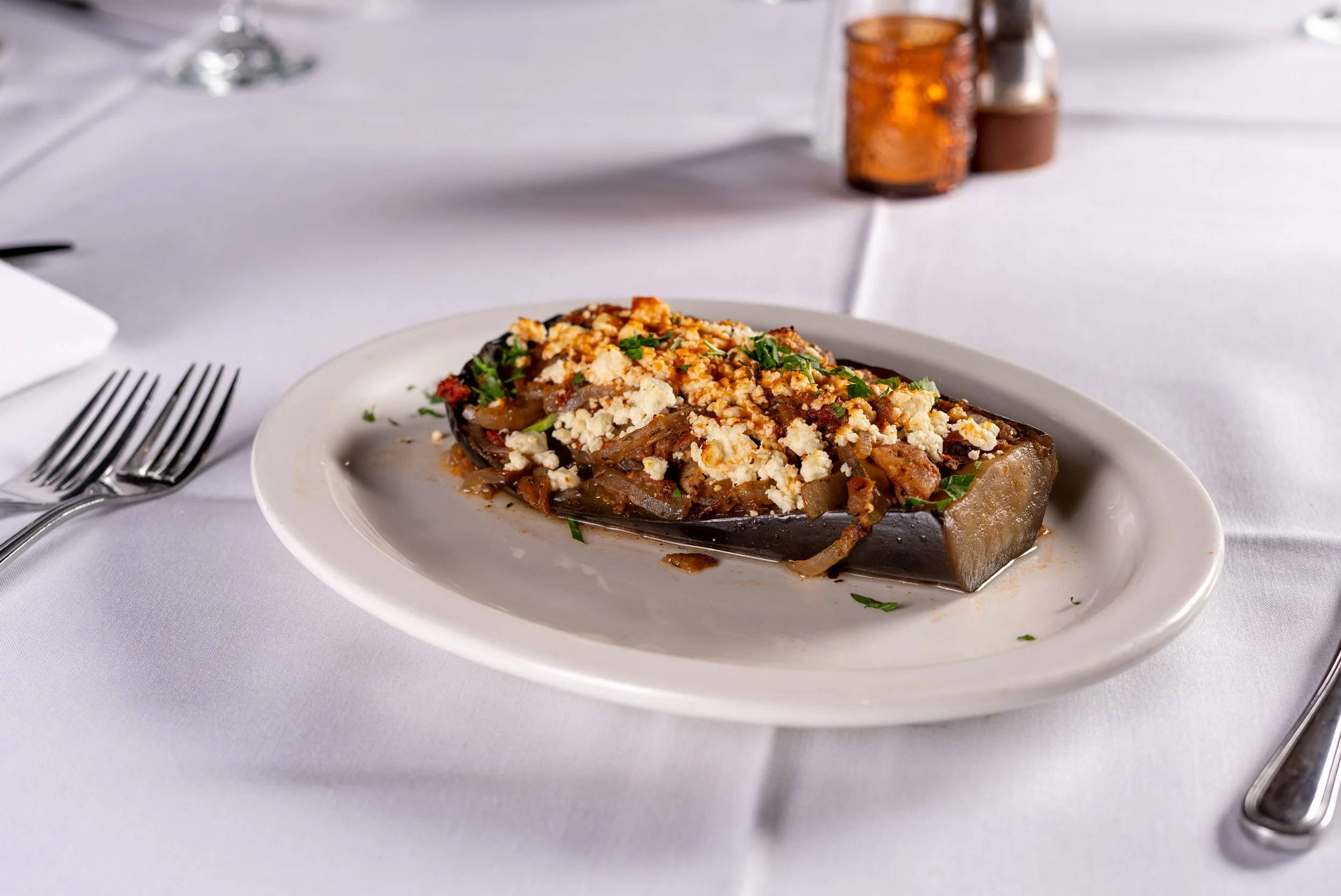 Description: Baked stuffed eggplant with onions, garlic, fresh tomatoes and spices, topped with choice of feta or mozzarella cheese.