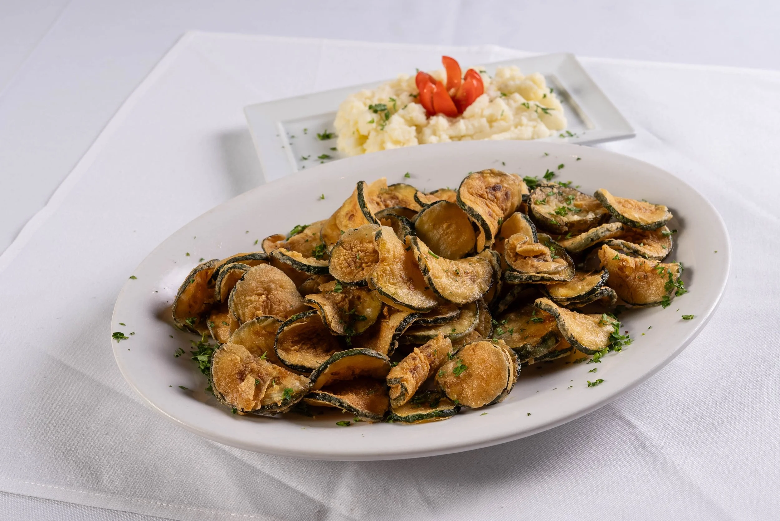 Description: Thin slices of lightly breaded zucchini, fried and served with our skordalia.