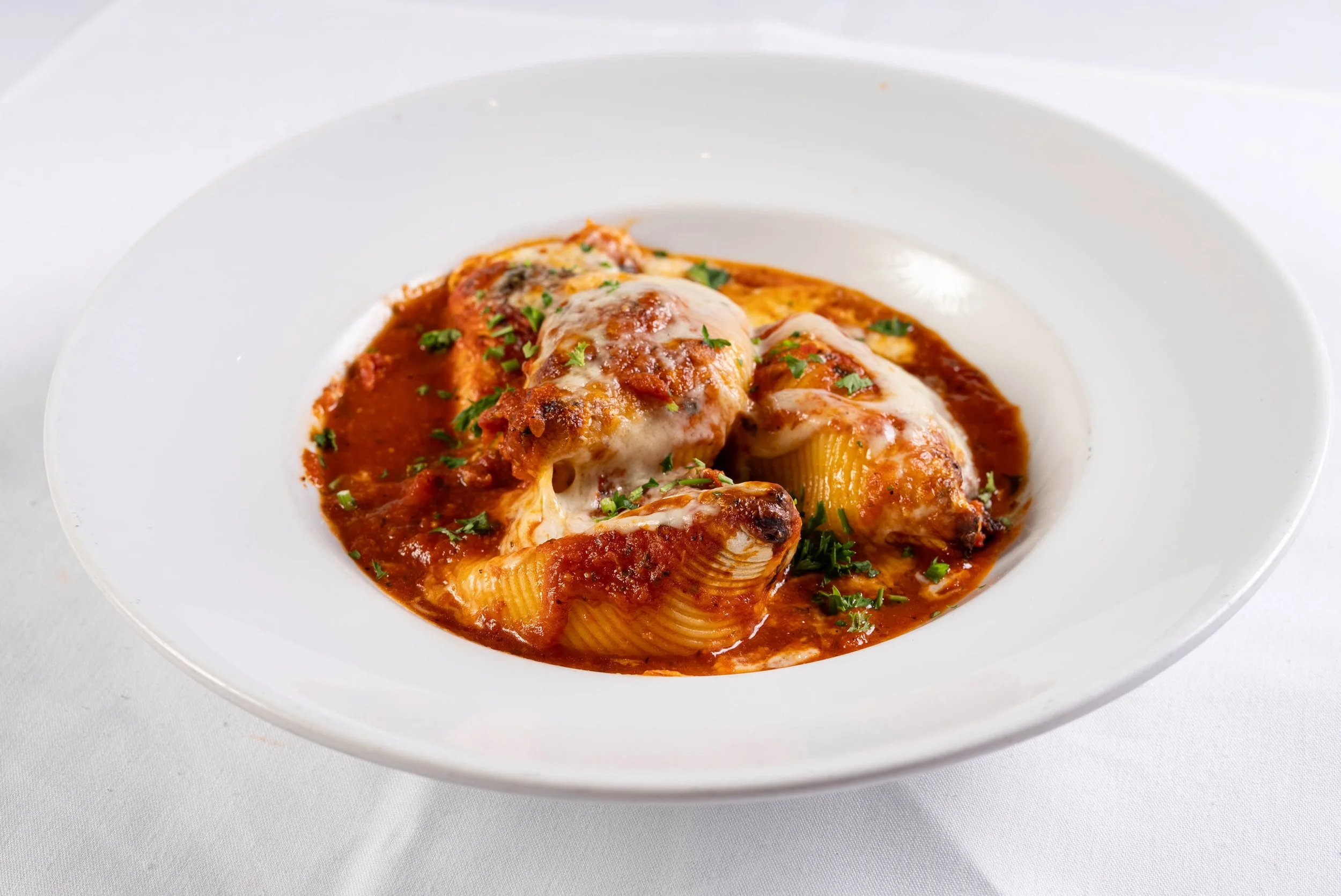 Description: Jumbo shell-shaped pasta stuffed with three cheeses, topped with tomato sauce and mozzarella.