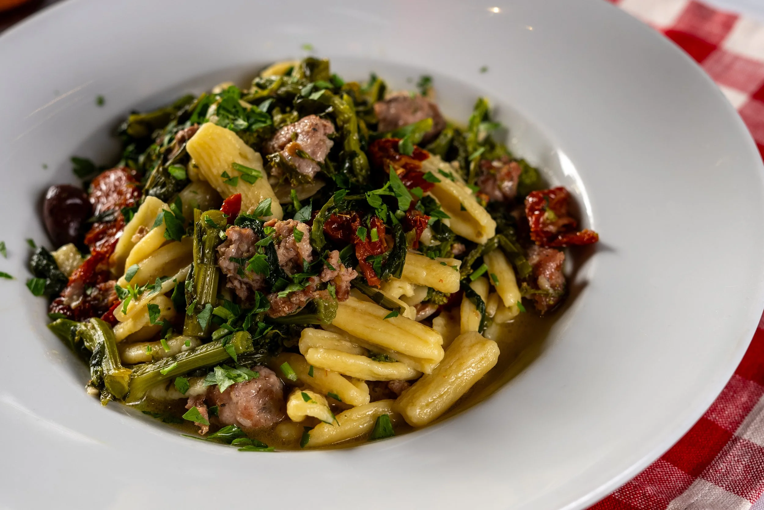 Description: cavatelli pasta prepared with broccoli rabe and sausage chunks, sautéed with garlic, EVOO, sun-dried tomatoes and black oil cured olives, with a hint of red pepper flakes.