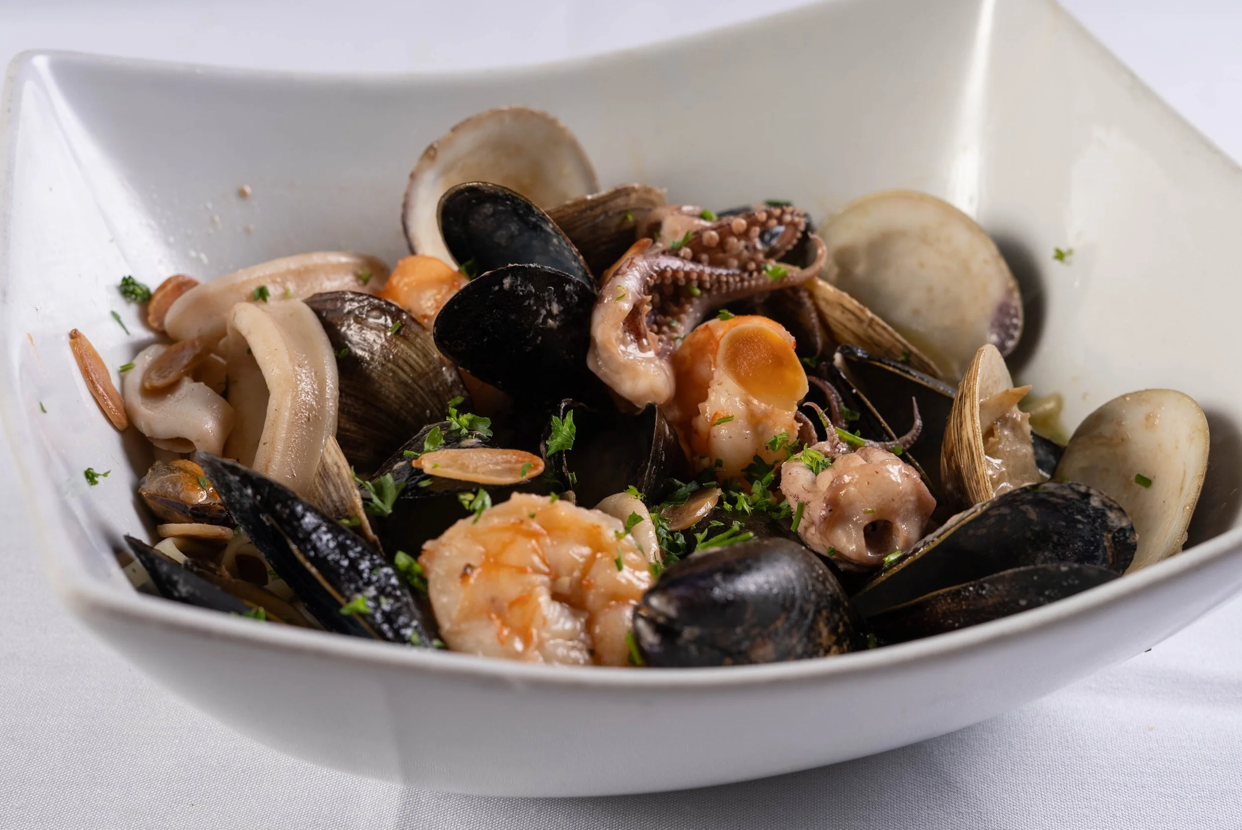 Description: combination of shrimp, clams, mussels and calamari, prepared in a creamy Almondine sauce, topped with toasted almonds, served over linguine.