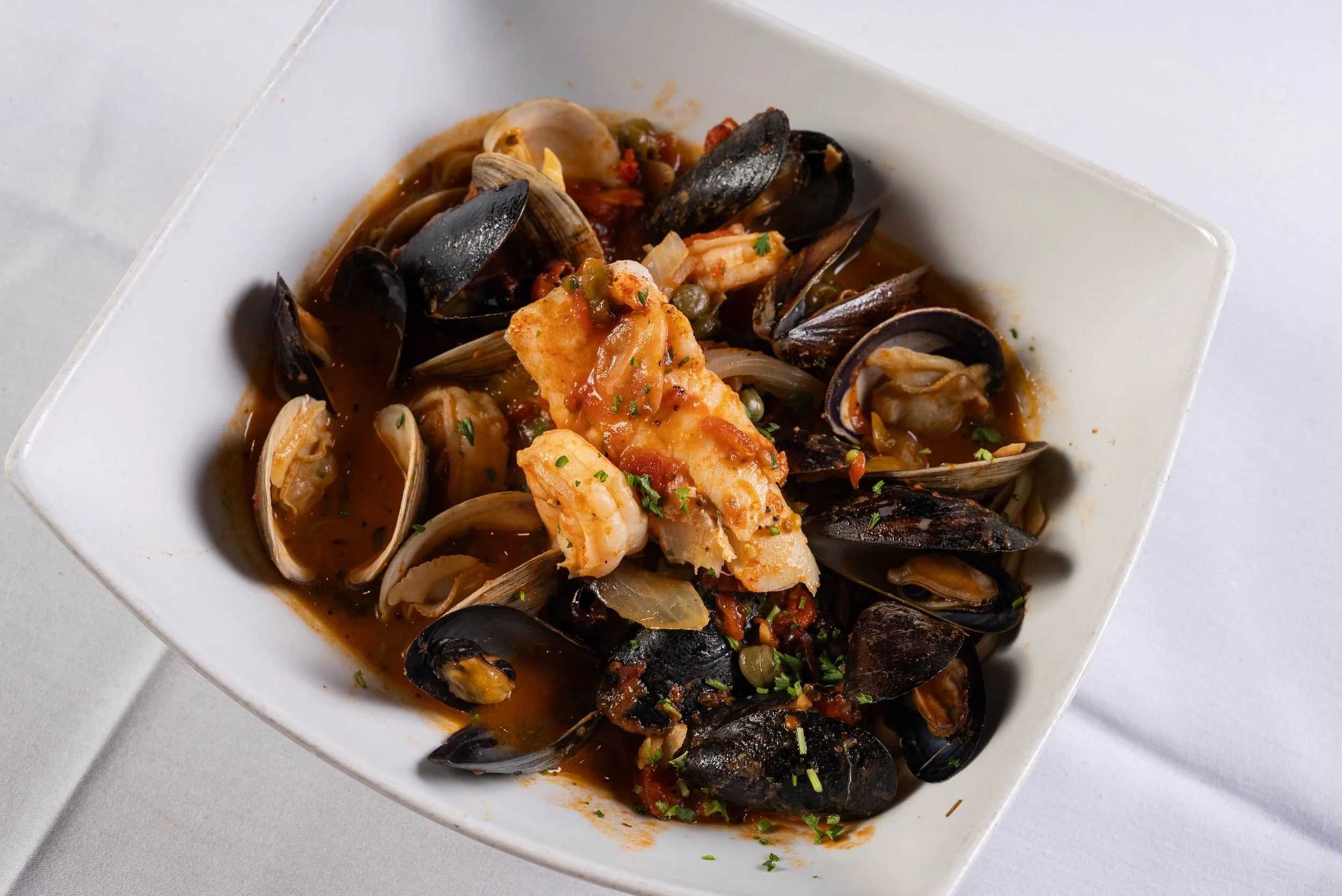 Description: Combination of cod, mussels, shrimp and clams, sauteed in a savory sauce of EVOO, garlic, onions, capers, kalamata olives, banana peppers and san marzano tomatoes, served over your choice of pasta.