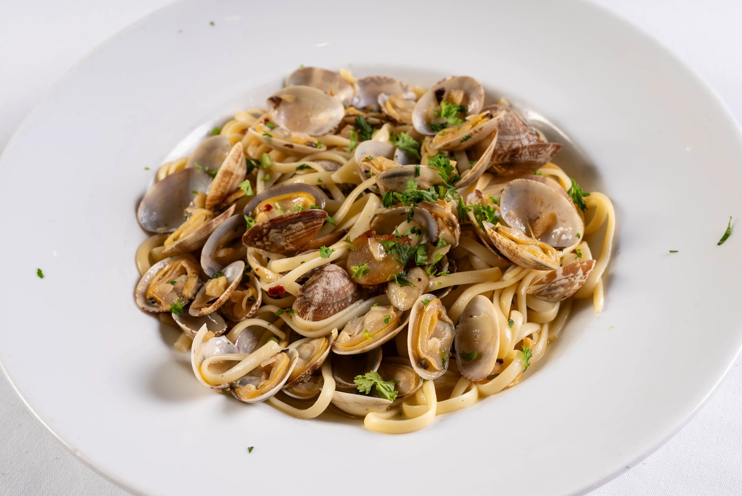 Description: Manila clams, sautéed with garlic and EVOO in a light San Marzano plum-tomato wine sauce.