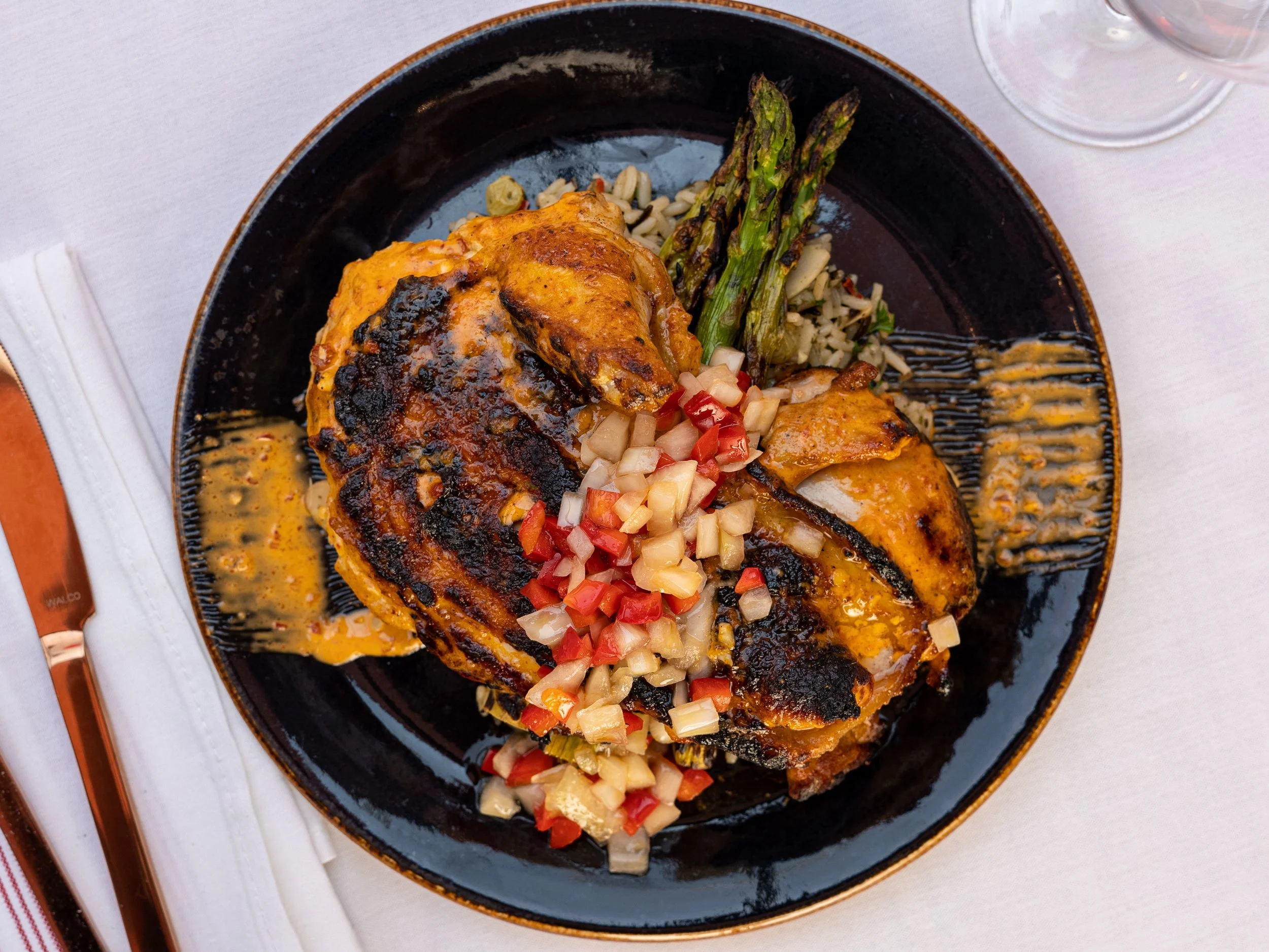 Description: Half Chicken aji marinated, with Andes Wild Rice, Grilled Asparagus Spears, Salsa Criolla, Rotisserie Sauce