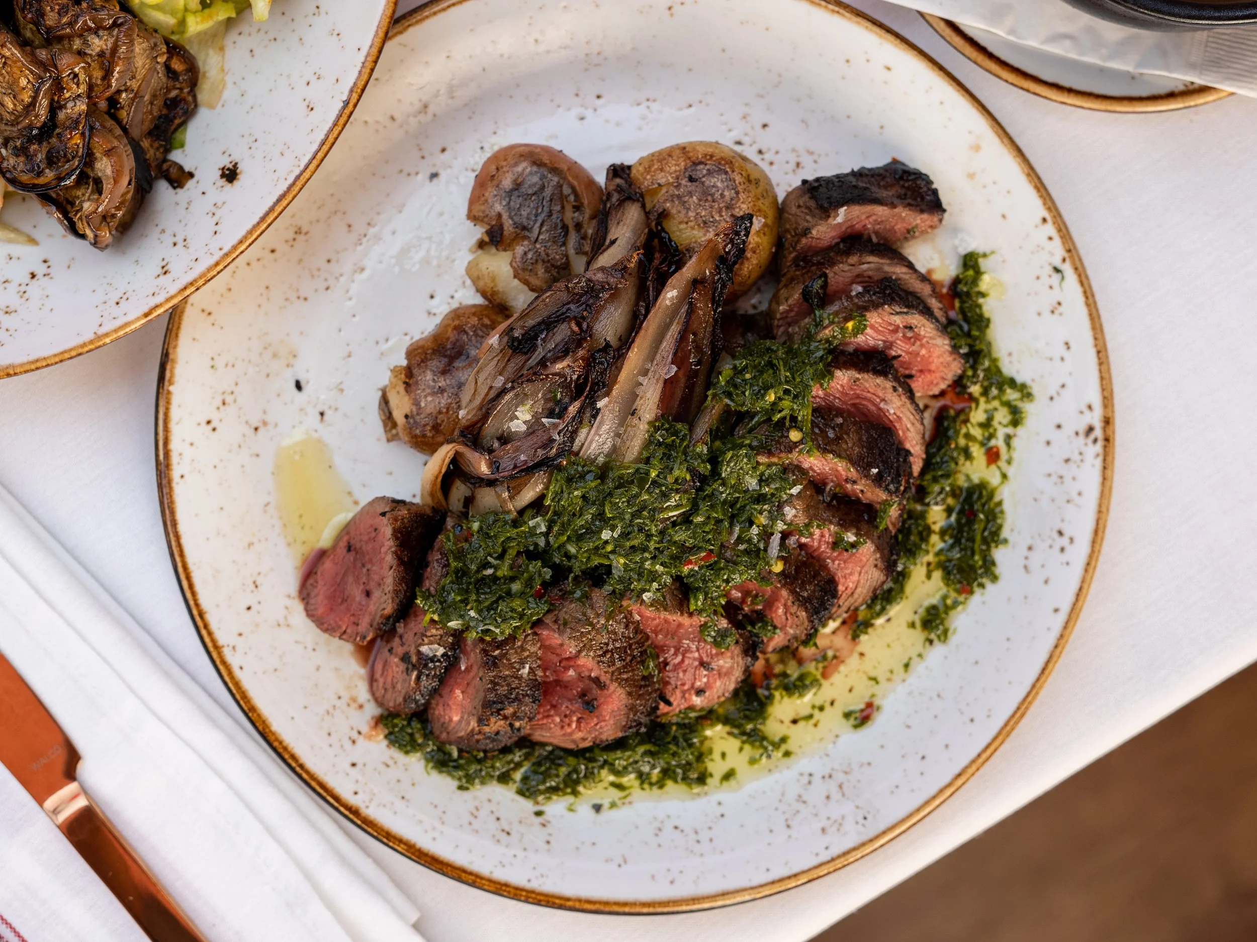 Description: 8 oz Sirloin, Crispy Potatoes, Roasted Garlic Head, Charred Endive, Chimichurri, Finishing Sea Salt
