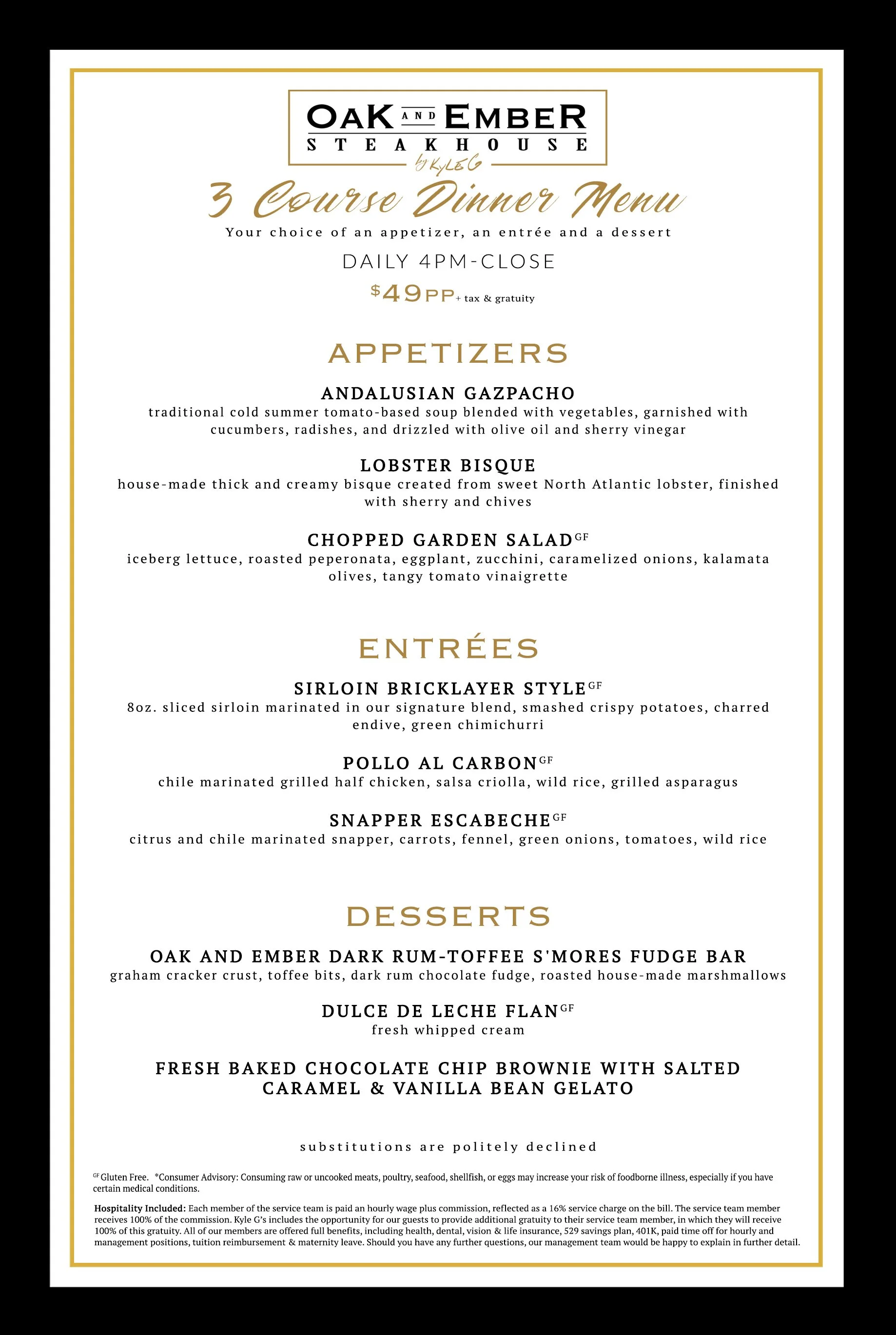 See below for more detailed information on the menu items that are NEW to Oak & Ember but on this 3 Course Menu