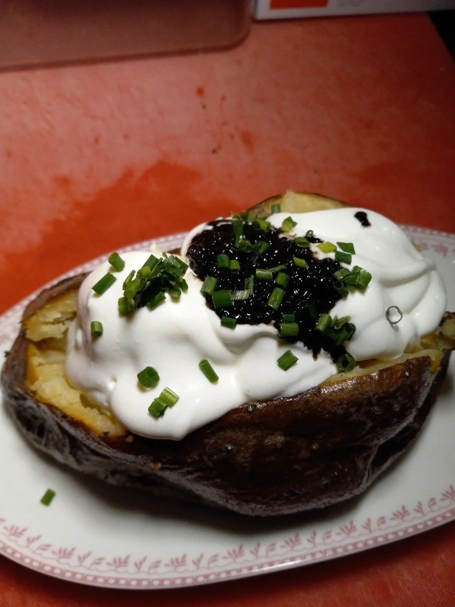 Description: 1# baked potato topped with whipped garlic butter, creme fraiche, ½ oz black american caviar, and chives