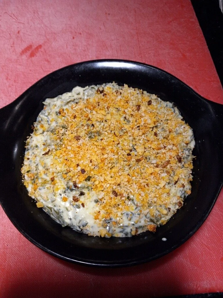 Description: 8 oz. creamed spinach made with a shallot parmesan béchamel, topped with toasted bread crumbs