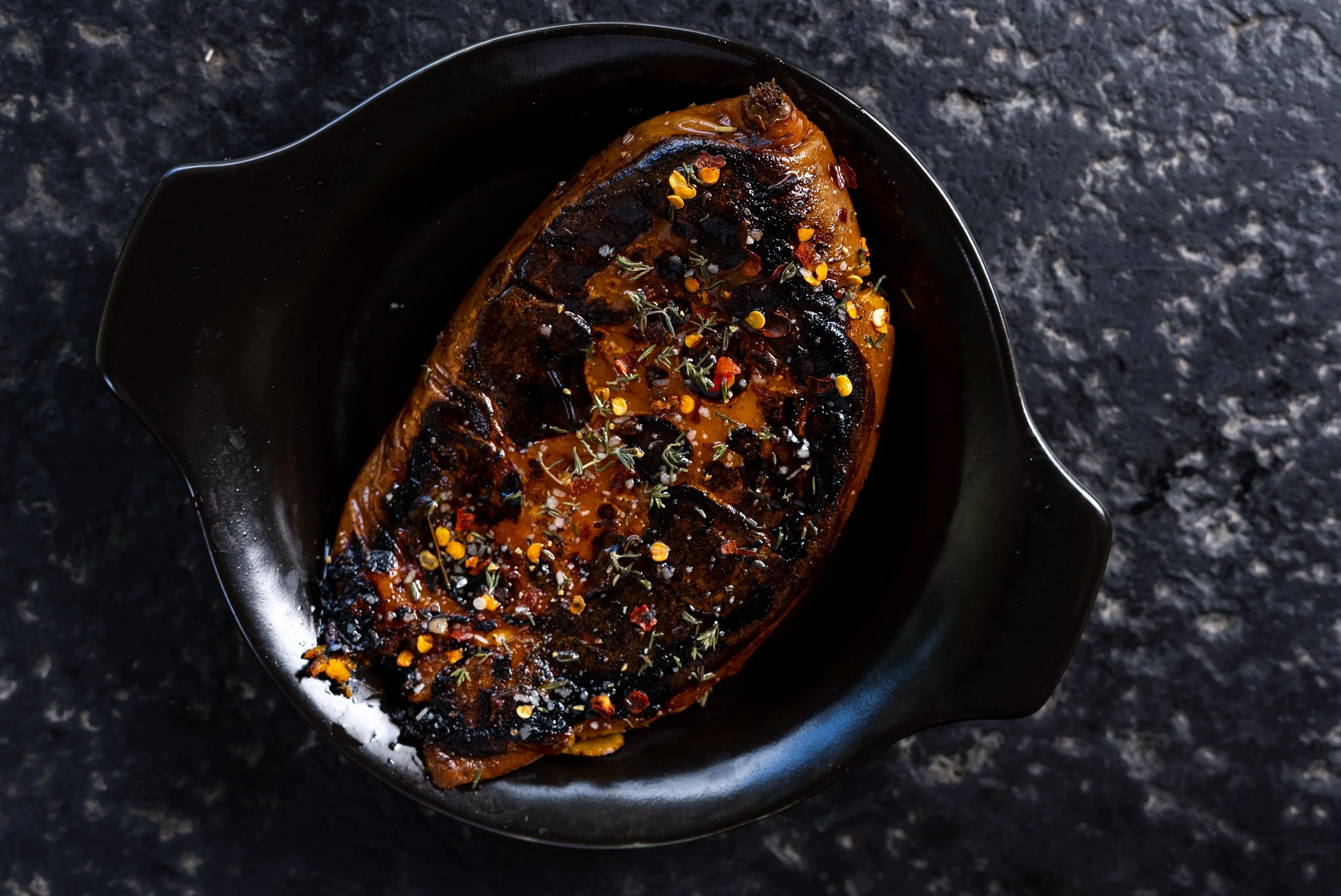 Description: 1 large whole sweet potato, slow cooked, then smashed and charred on the placha for a crispy charred skin, then dressed with thyme & chili infused honey.