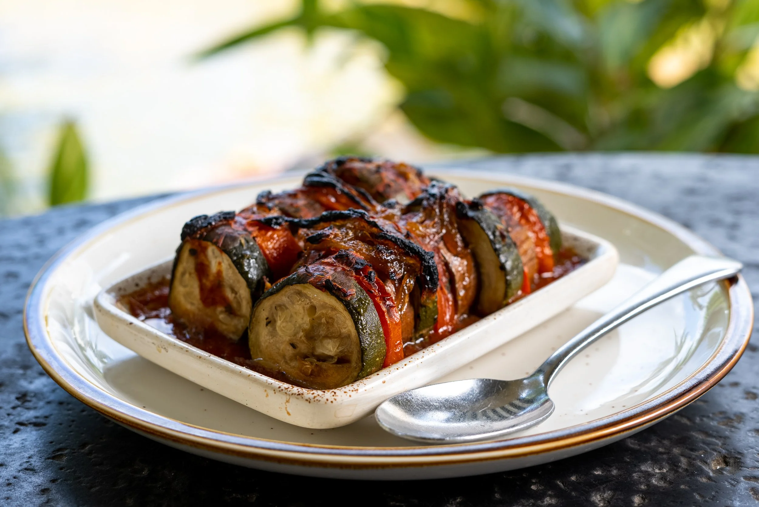 Description: Stacked and roasted zucchini, tomato, and eggplant, topped with a fire roasted tomato relish and caramelized pearl onions
