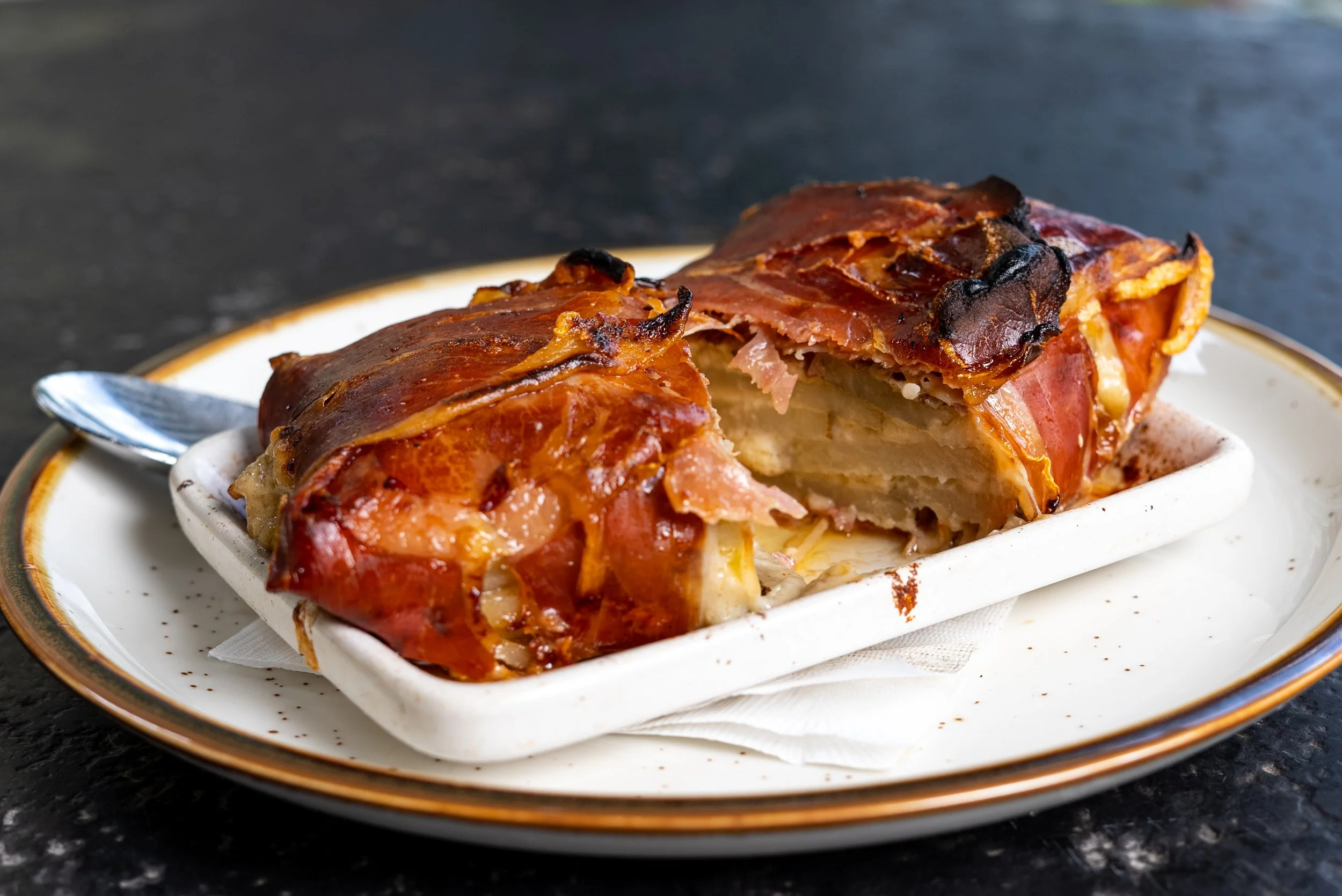 Description: Thinly sliced potatoes layered with a gruyere and gouda béchemel, wrapped in crispy serrano ham, served sizzling hot