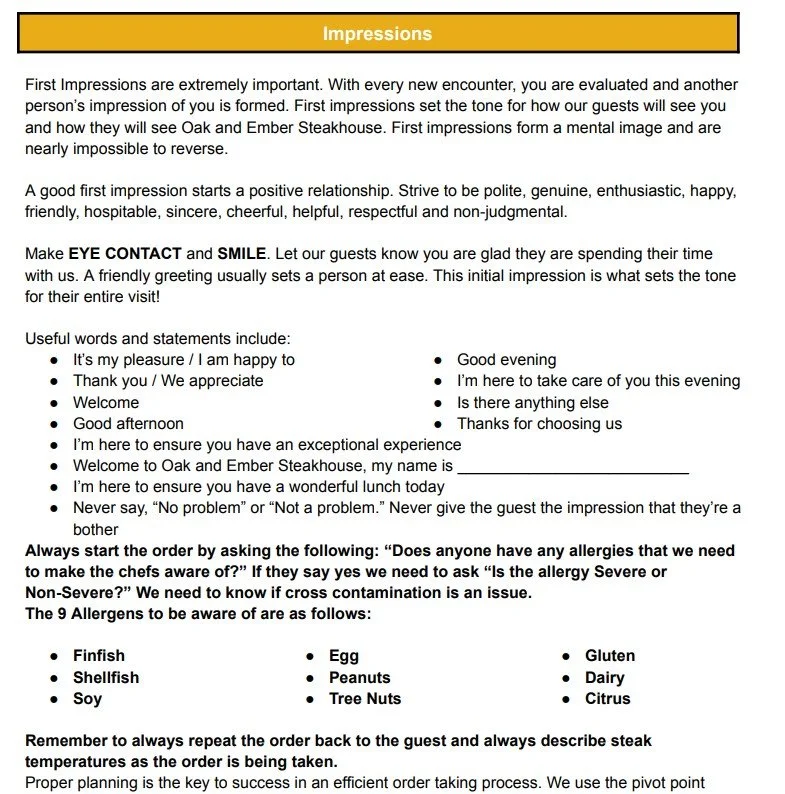Proper tools and apart of your uniform- (Crumer, wine key, tongs, flashing light, lighter, CLEAN POLISHING RAGS, Server book w/ pads)
