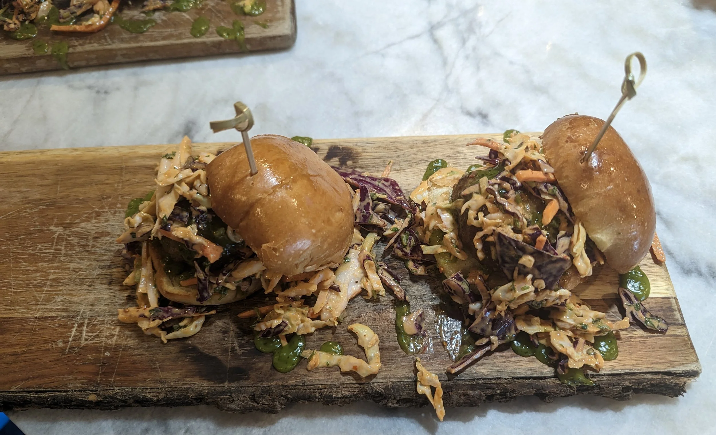 Description: 2 Lamb sliders served on brioche buns, served with Thai basil pesto and chipotle slaw