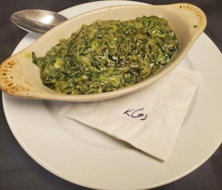 Description: Fresh spinach leaf, cooked with cream and thickened with roux. Lightly seasoned with salt, pepper, and nutmeg. Or simply wilted with EVOO and Garlic.